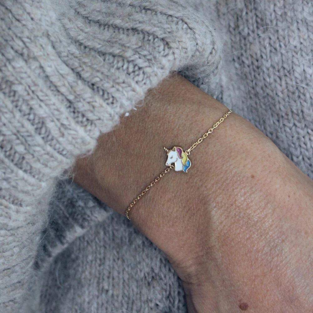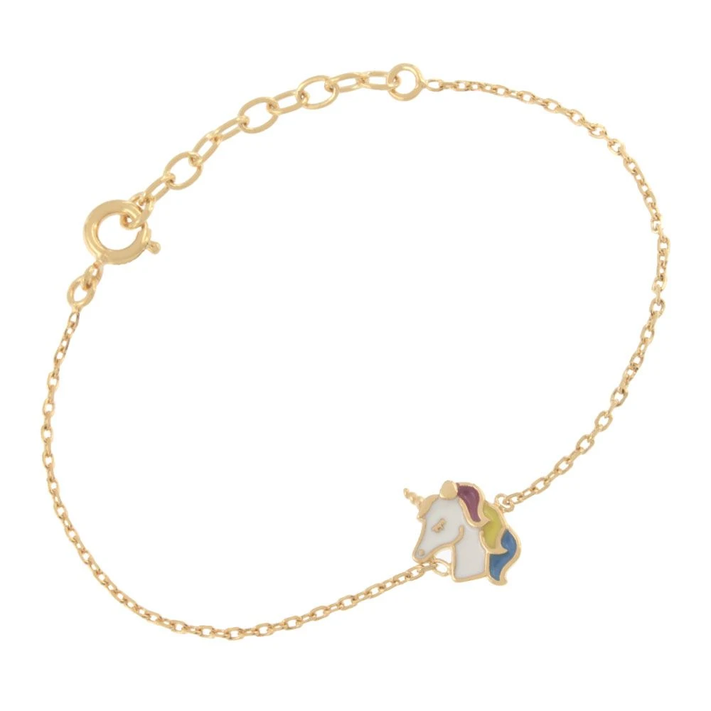 A la fois symbole de pureté et d’innocence, cette jolie petite licorne émaillée en médaillon, sur un bracelet plaqué or, embellira tous les petits poignets.
