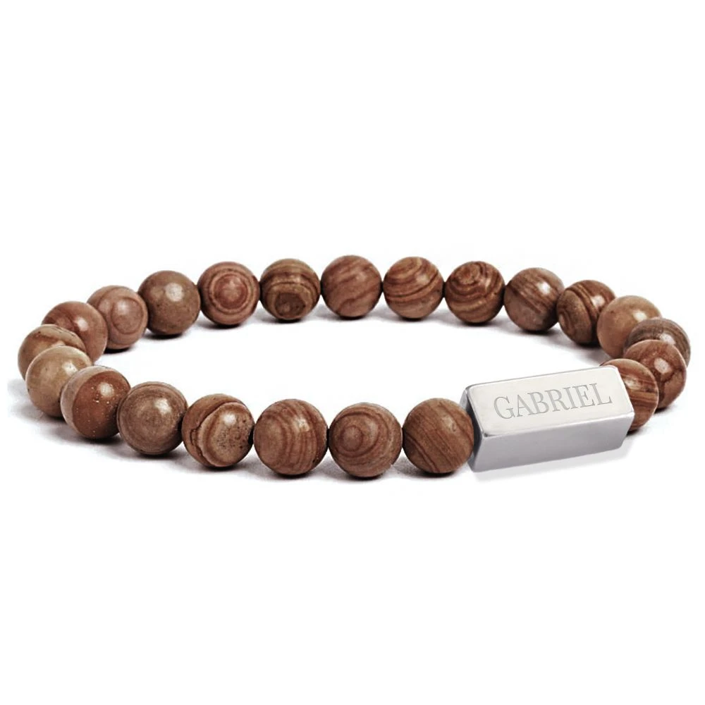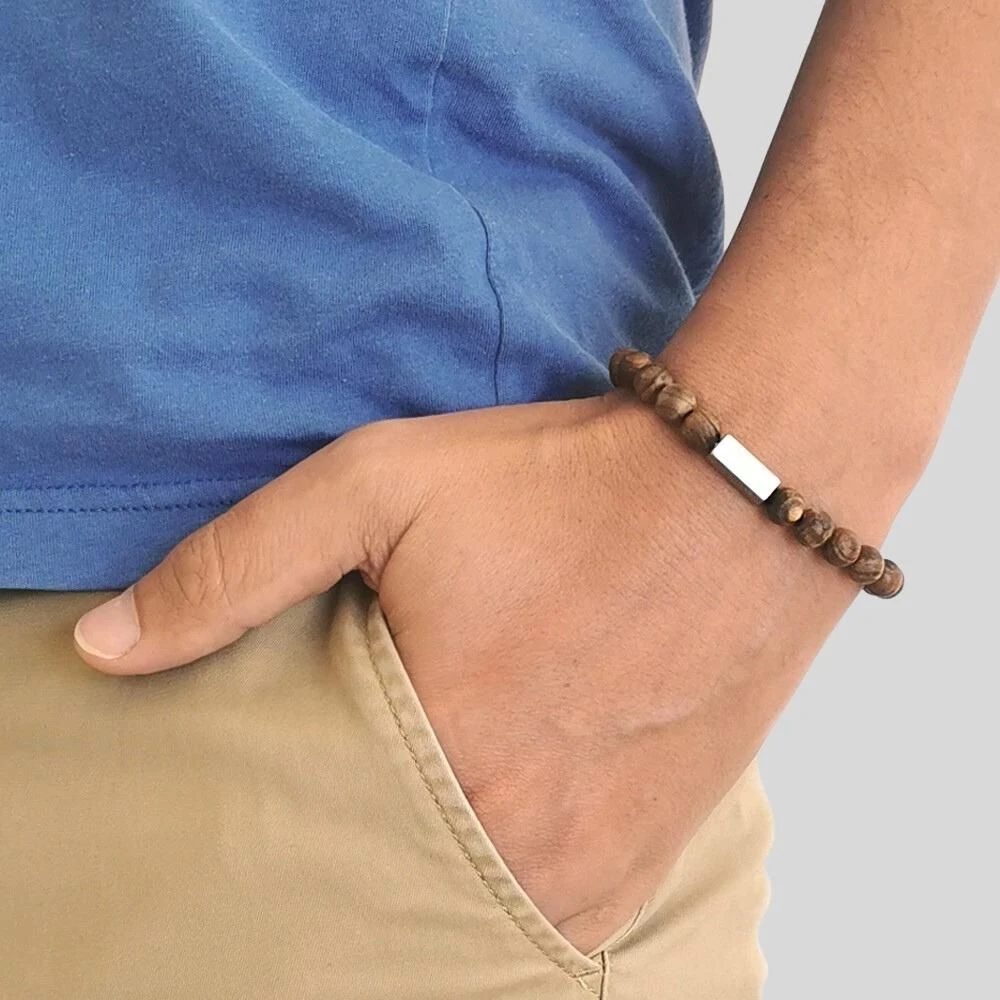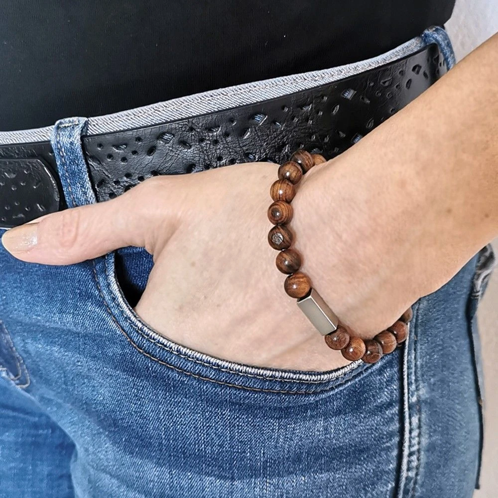 Joli bracelet extensible en bois en forme de perles polies agrĂ©mentĂ©es d’un Ă©lĂ©ment Ă quatre faces en acier poli gravable sur chaque cĂ´tĂ© et montĂ© sur un Ă©lastique pour plus de confort. Il est disponible en trois tailles : la taille 18,5 cm est plus adaptĂ©e aux poignets fĂ©minins, 20 cm pour les poignets masculins fins et la taille 21,5 cm aux autres poignets masculins. La première gravure diamant est offerte. La matière en bois confère Ă ce bracelet un aspect naturel, robuste et lĂ©ger Ă la fois. C’est parfait comme cadeau Ă offrir ou pour se faire plaisir.