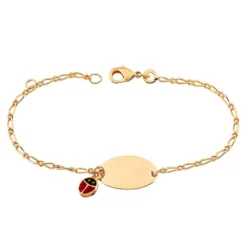 Mignon bracelet de 16 cm en plaqué or 3 microns avec sa plaque ovale et sa pampille coccinelle rouge et noire. La coccinelle apportera sa bénédiction à ceux qui la portent. Profitez de la première gravure diamant offerte avec un nom, des initiales ou encore un symbole. C’est parfait comme cadeau à offrir à une petite fille à l’occasion d’une naissance ou d’un anniversaire.