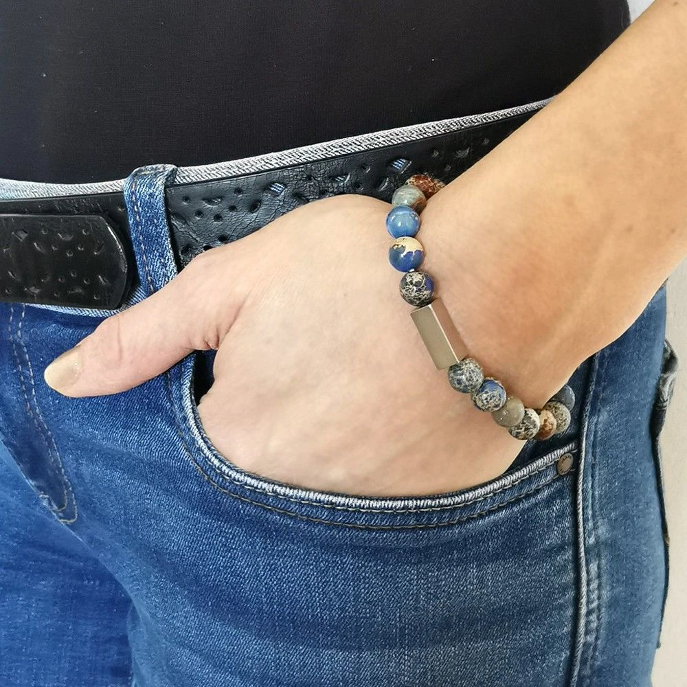 Joli bracelet extensible en pierre naturelle de quartz mosaĂŻque bleu. Avec ses perles polies, il est agrĂ©mentĂ© d’un Ă©lĂ©ment Ă quatre faces en acier poli gravable sur chaque cĂ´tĂ© et montĂ© sur un Ă©lastique pour plus de confort. Il est disponible en trois tailles : la taille 18,5 cm est plus adaptĂ©e aux poignets fĂ©minins, 20 cm pour les poignets masculins fins et la taille 21,5 cm aux autres poignets masculins. La première gravure diamant est offerte. Au-delĂ de ses vertus facilitant l’expression et favorisant la guĂ©rison, le quartz mosaĂŻque bleu aurait la capacitĂ© d’augmenter la paix intĂ©rieure. C’est parfait comme cadeau Ă offrir ou pour se faire plaisir.