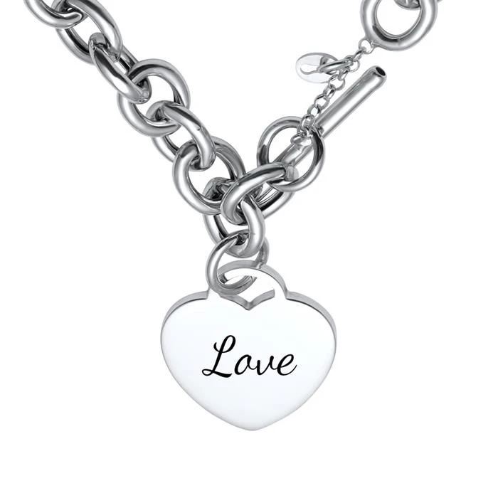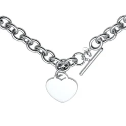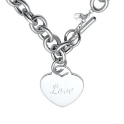 Elégante chaîne en anneau rond et pendentif coeur en argent massif 925 rhodié avec un fermoir à bascule (en T) pour un plus grand confort. La première gravure diamant est offerte.