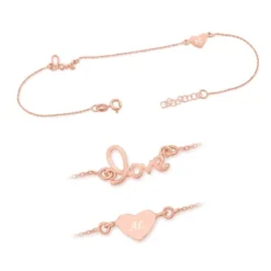 Très jolie et originale chaîne de cheville argent rosée massif 925 composée d’une écriture « Love » ainsi qu’un cœur personnalisable recto/verso. Vous pourrez y graver les initiales de chacun par exemple, la 1ère gravure est offerte! Réglable en longueur de par ses anneaux supplémentaires, il s’agit d’un très beau cadeau à offrir pour une femme que l’on affectionne. La chaîne de cheville est synonyme de sensualité et féminité.