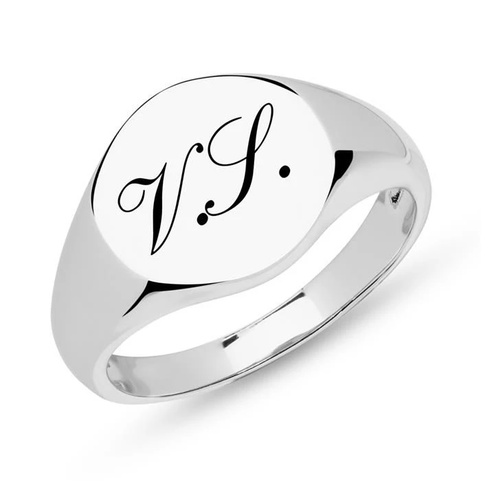 Très belle bague en argent 925 type chevalière, personnalisable au recto avec 2 initiales. Modèle intemporel, les femmes tomberont sous le charme de cette bague. Le fait que la bague puisse être personnalisée selon vos propres idées en fait également une idée de cadeau idéal. Dotée d’un plaquage au rhodium, l’anneau est résistant à la ternissure. Profitez de la première gravure diamant offerte avec un nom, une date, ou encore un symbole.