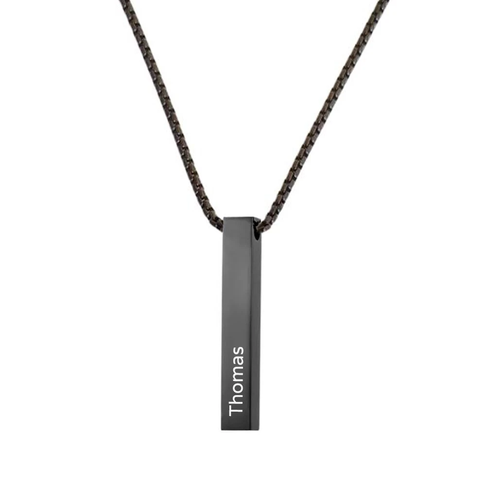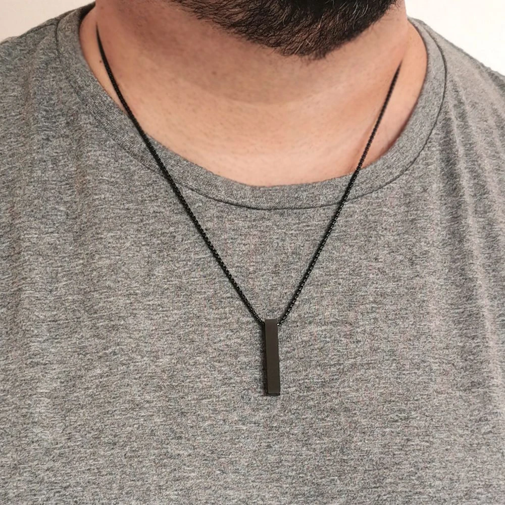 Joli collier avec un pendentif barre en acier noir poli Ă quatre faces et sa chaĂ®ne assortie de 60cm en maille vĂ©nitienne. Le pendentif est personnalisable avec une gravure possible sur chaque cotĂ©. Profitez de la première gravure diamant offerte avec un nom, une date ou encore symbole. C’est parfait comme cadeau Ă offrir ou pour se faire plaisir lors d’une fĂŞte ou un anniversaire par exemple.