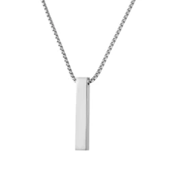 Joli collier avec un pendentif barre en acier poli rectangulaire Ă quatre faces et sa chaĂ®ne assortie de 60cm en maille vĂ©nitienne. Le pendentif est personnalisable avec une gravure possible sur chaque cotĂ©. Profitez de la première gravure diamant offerte avec un nom, une date ou encore symbole. C’est parfait comme cadeau Ă offrir ou pour se faire plaisir lors d’une fĂŞte ou un anniversaire par exemple.