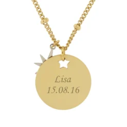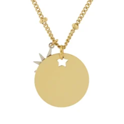 Joli collier avec ses deux pendentifs, l’un est une plaque ronde en acier doré qui met parfaitement en valeur l’autre qui est une petite étoile argentée. Sa chaîne perlée, assortie au premier médaillon et ajustable sur 5 cm, est très tendance. Pour le rendre tout à fait unique, personnalisez le avec la gravure de votre choix.