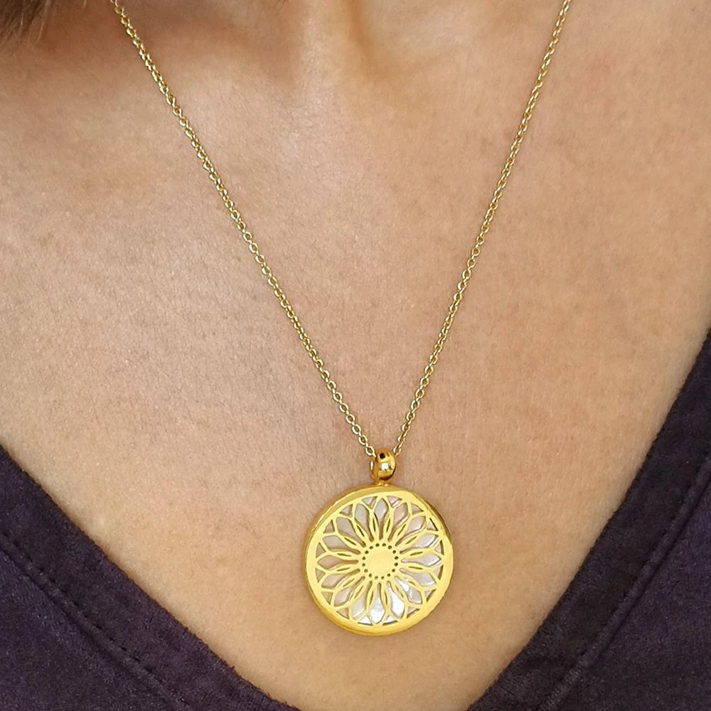 Joli collier avec son pendentif rond ajouré d’une fleur en argent doré sur un fond de nacre. Ce dernier est accompagné d’une chaîne en maille forçat de 45 cm avec un anneau intermédiaire qui permet d’adapter sa longueur. Le fermoir est un anneau à ressort pour un plus grand confort et plus de sécurité. La rosace marguerite issue de la géométrie sacrée avec la nacre est un beau symbole de lumière, création, beauté, harmonie, sagesse et amour. Profitez de la première gravure diamant offerte pour personnaliser le verso avec un symbole, un nom ou encore une date. C’est parfait comme cadeau à offrir ou pour se faire plaisir tout simplement.