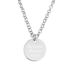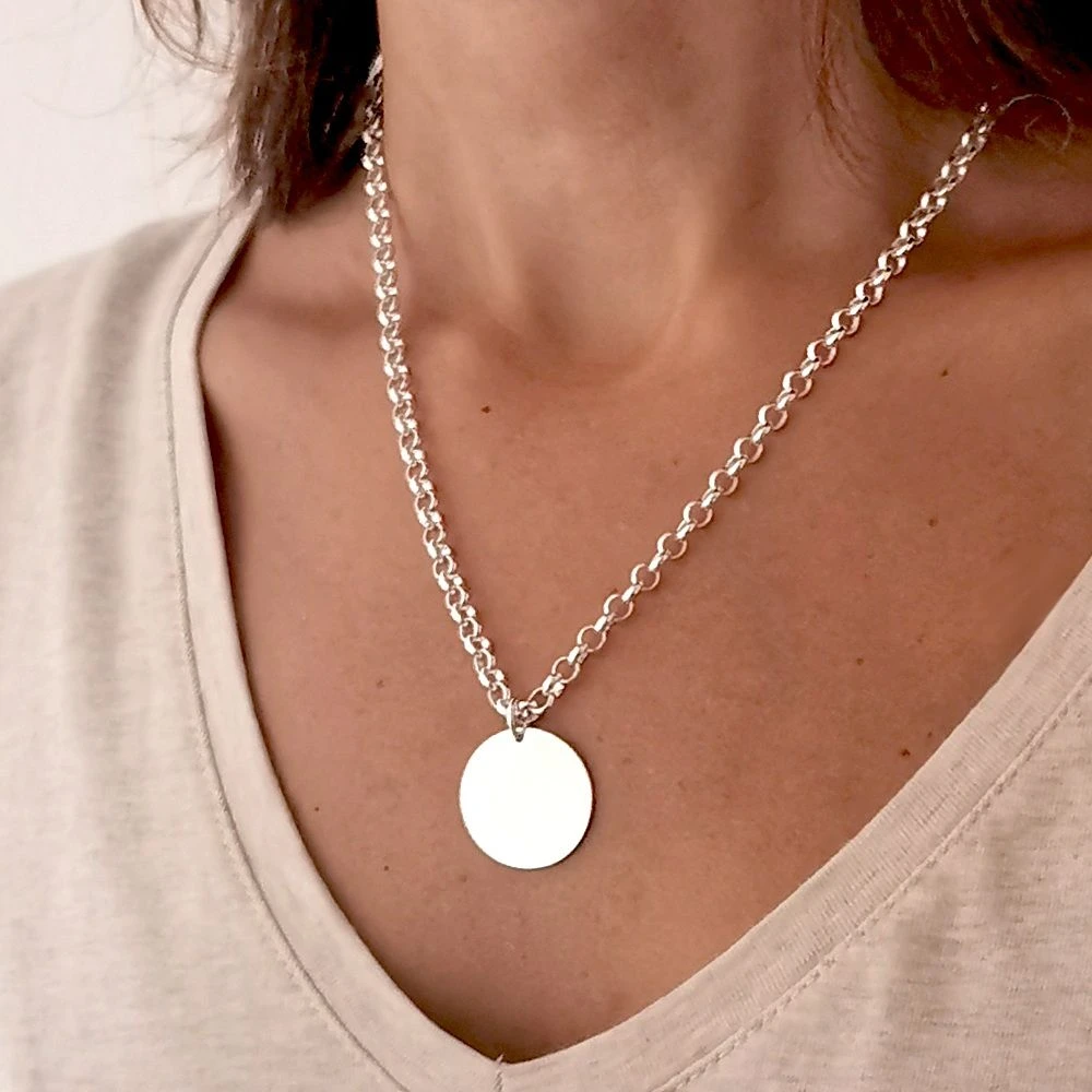 ElĂ©gant collier avec sa large maille jaseron et sa mĂ©daille ronde argent poli et gravable. La maille jaseron est une succession de petits anneaux ronds, qui est très tendance. Le collier possède un fermoir mousqueton pour un plus grand confort. Une extension intĂ©grĂ©e au collier permet d’adapter la longueur d’environ 4 cm. Profitez de la première gravure diamant offerte avec un nom, une date ou encore un symbole. C’est parfait comme cadeau Ă offrir Ă une femme lors d’un Ă©vènement important comme une fĂŞte ou pour se faire plaisir tout simplement.