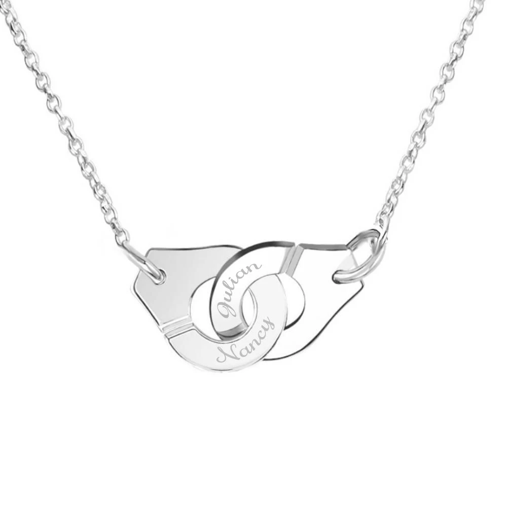 Ras du cou avec breloque « paire de menottes » en argent 925 millièmes. Les menottes enlacĂ©es, symbole d’union, incarnent l’amour, l’amitiĂ©, le lien.  De longueur rĂ©glable de 37 Ă 41 cm grâce Ă sa chaine de rallonge, vous pouvez graver deux prĂ©noms. Vous dĂ©sirez montrer Ă quel point vous ĂŞtes attachĂ©s Ă votre moitiĂ©, ce collier est parfait pour vous ! La première gravure diamant est offerte. Vous trouverez sur notre site le bracelet assorti.