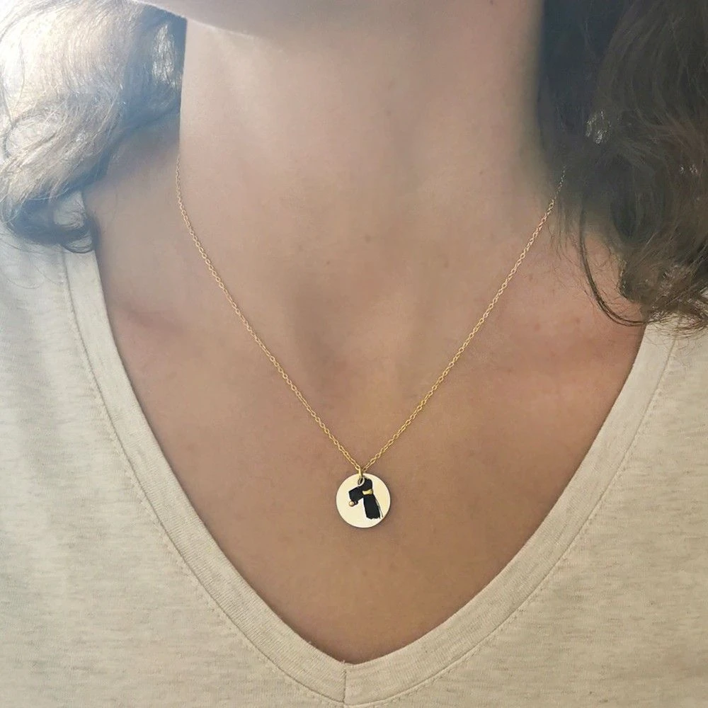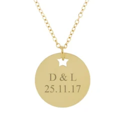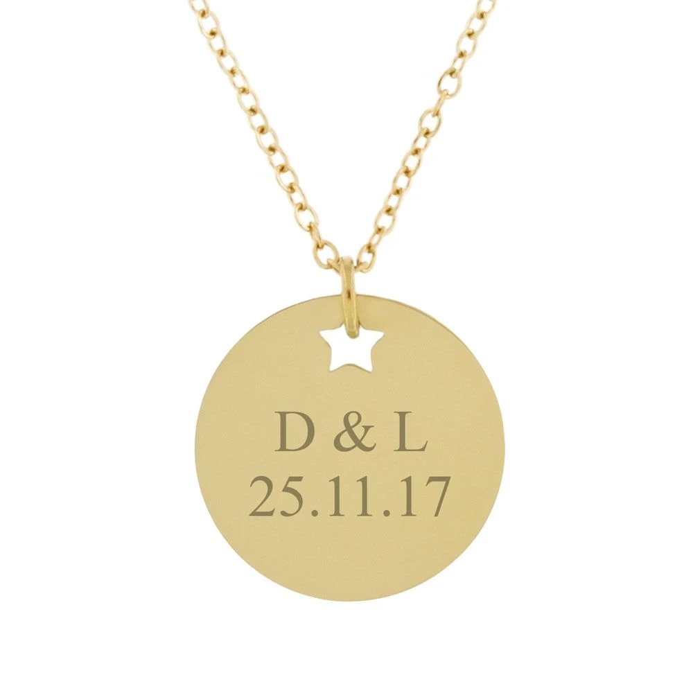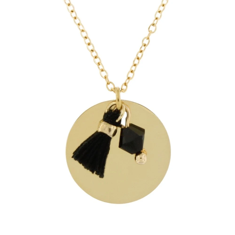 Très tendance ce collier est fait en acier inoxydable doré. Il se compose d’une médaille ronde à personnaliser à l’aide d’une gravure, d’une chaîne assortie et ajustable, d’un pompon noir et une très jolie petite perle noire également. Cette association de trois petits pendentifs doré et noirs lui confère un look à la fois raffiné et original.