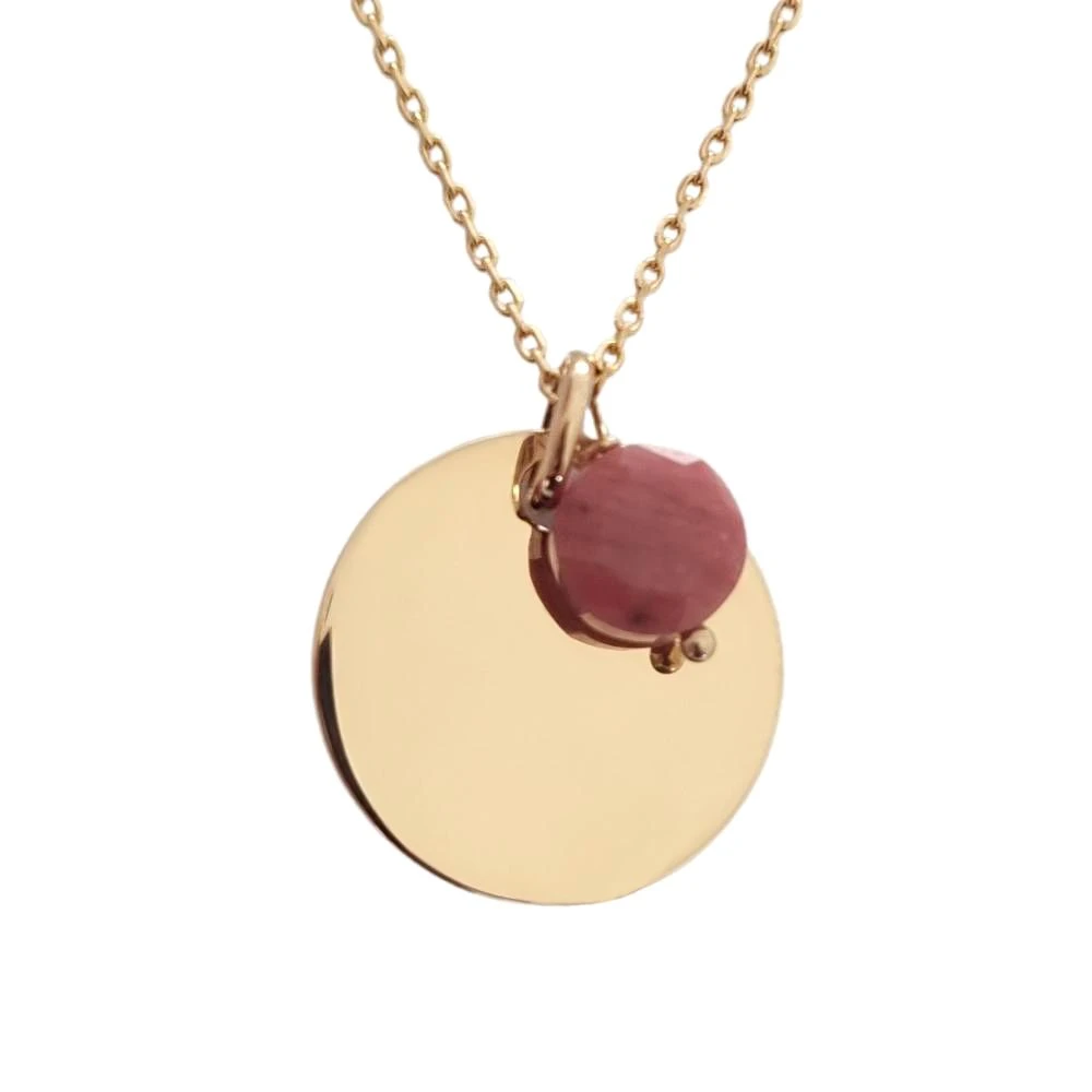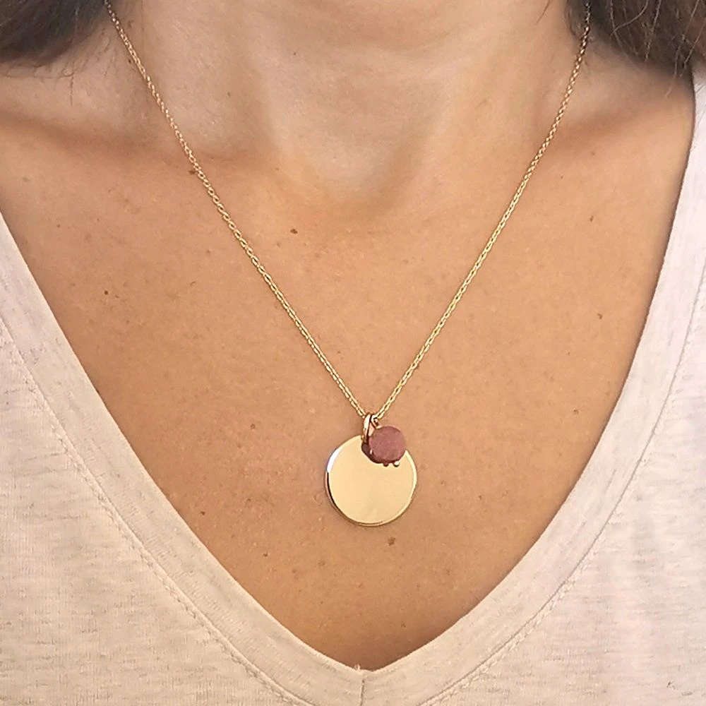 Collier élégant et minimaliste avec sa pierre rhodonite de couleur rose. En plaqué or, ce bijou est composé d’une chaine de 42 cm ajustable jusqu’à 45 cm, d’une petite pierre rose et d’un médaillon gravable avec le texte ou un symbole de votre choix. A porter au quotidien, il peut aussi ajouter une note d’élégance à une tenue de soirée.
