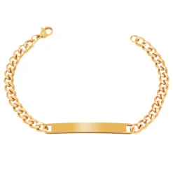 Très jolie gourmette en acier dorée de taille 18, 20 ou 22 cm, à personnaliser suivant vos envies. Possibilité de graver au recto/verso avec une première gravure offerte. Elégante et à la fois moderne elle séduira sans aucun doute la gent féminine. Dotée d’un fermoir carabine pour une meilleure sécurité. C’est une idée de cadeau très bien choisie pour une femme que l’on adore.