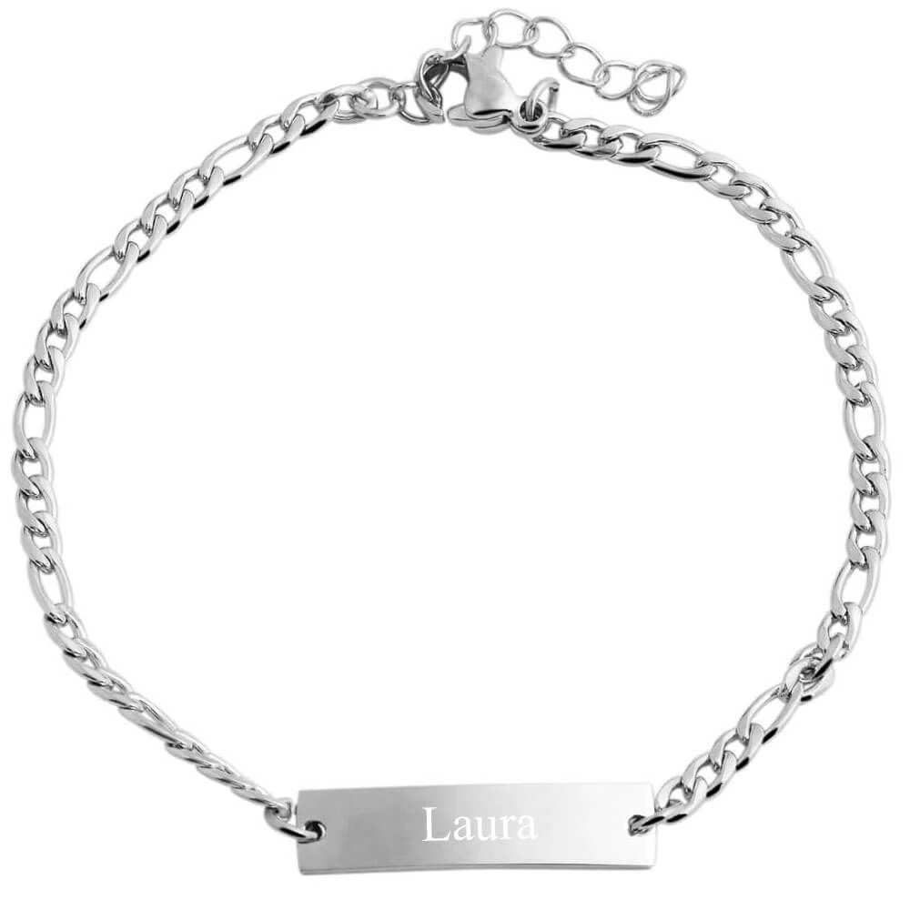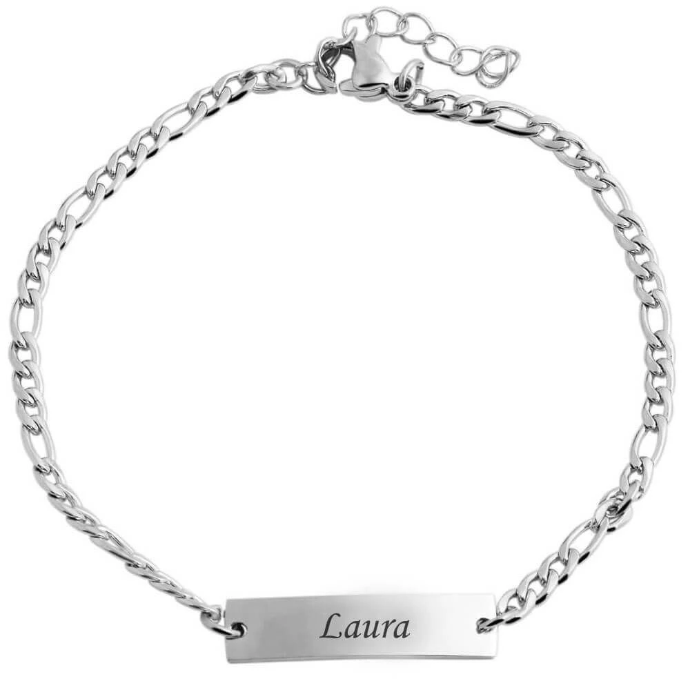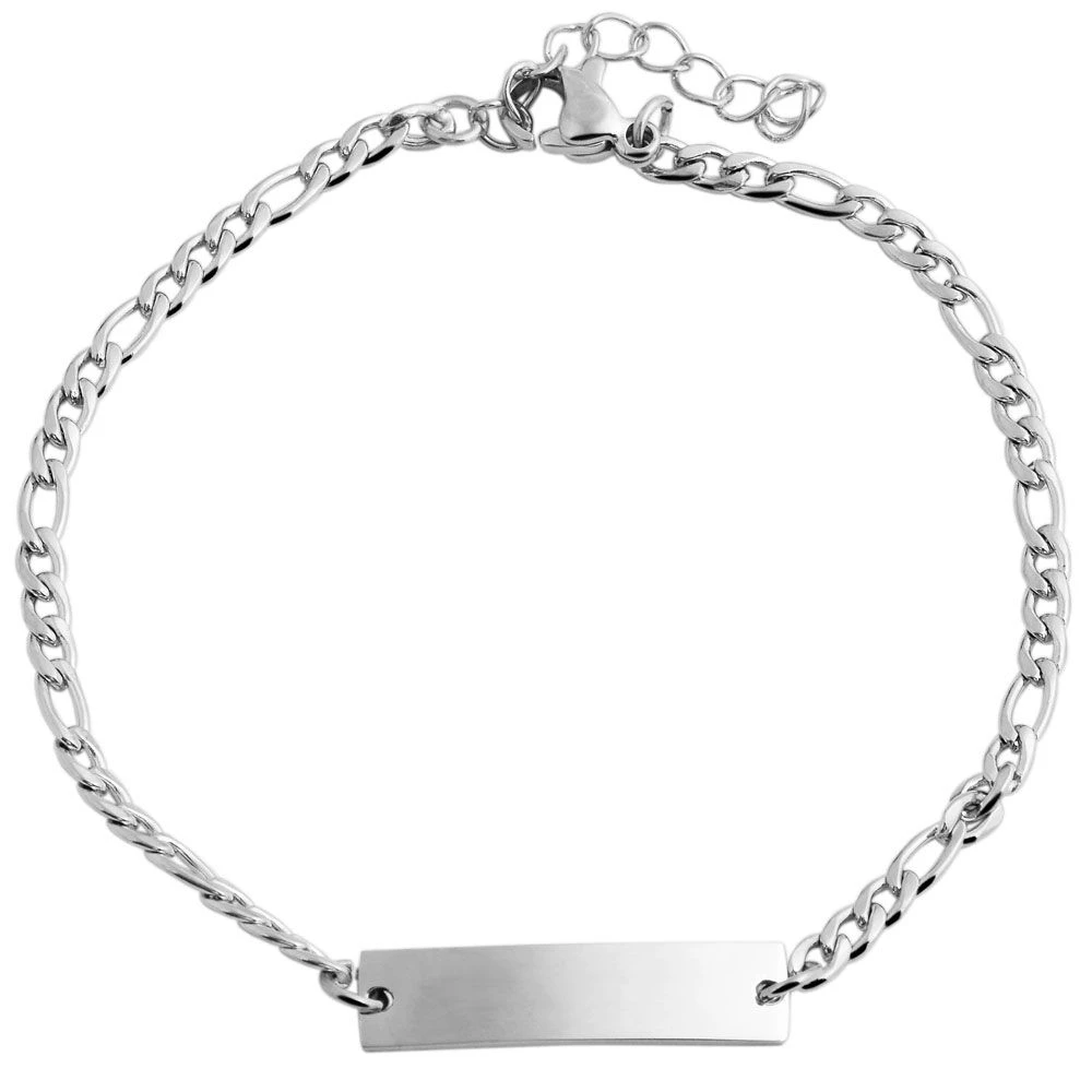 Cette Ă©lĂ©gante petite gourmette en acier, faite d’une maille figaro, avec une plaque d’identitĂ© gravable en recto-verso est agrĂ©mentĂ©e d’un fermoir carabine pour une meilleure sĂ©curitĂ©. la gravure diamant au choix parmi 6 polices de style diffĂ©rent est offerte.