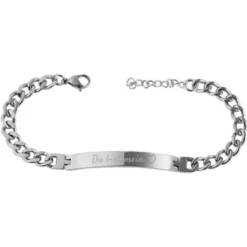 Intemporelle et fine gourmette en acier inoxydable pour femme avec sa plaque de gravure originale. La longueur du bracelet est de 17cm et une chaine d’extension permet de le porter jusqu’Ă 20cm. Cette gourmette est personnalisable au recto et au verso avec la première gravure diamant offerte. C’est un cadeau idĂ©al pour faire plaisir.