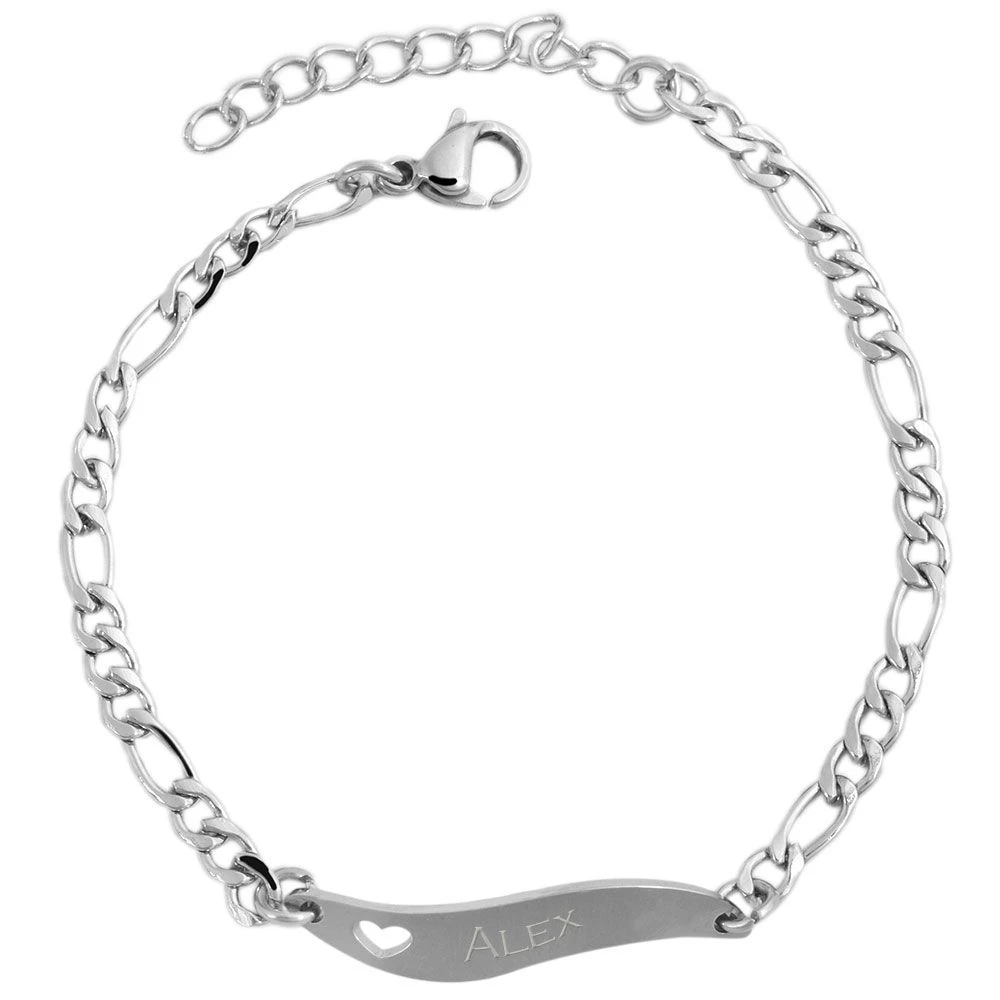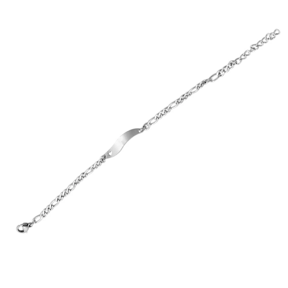 Originale gourmette en acier inoxydable en forme de vague avec un motif cĹ“ur. Il s’agit d’une maille figaro d’une longueur adaptable grâce Ă ses multiples anneaux Ă la fermeture. Sa plaque d’identitĂ© permet une gravure diamant recto qui vous sera offerte. Il s’agit d’un joli cadeau pour un ĂŞtre cher.