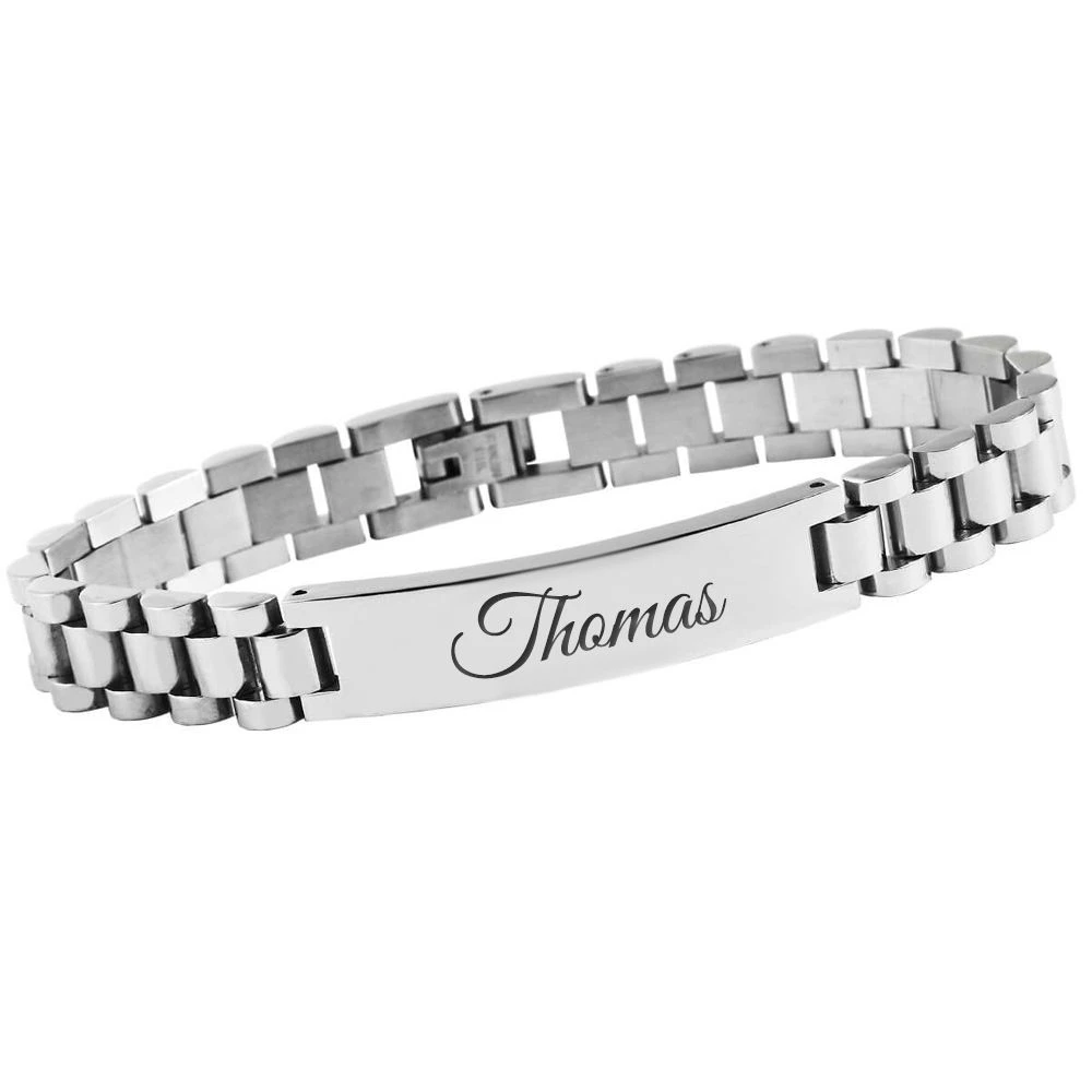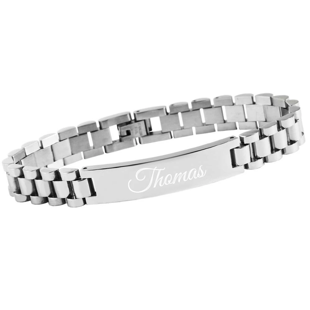 Très jolie gourmette en acier inoxydable personnalisable au recto/verso. Ce bracelet est disponible en 2 tailles au choix: 19,5 cm (pour les poignets fins) et 21cm. La taille 21cm est ajustable grâce Ă ses maillons que l’on peut retirer et il est ainsi possible de le porter plus court. Le bracelet de ce bijou est magnifique, classe et moderne Ă la fois, il sĂ©duira de nombreux hommes soucieux de leur look. C’est un joli cadeau Ă offrir pour une belle occasion comme un anniversaire ou la Saint Valentin. Adorez faire plaisir avec un bijou personnalisĂ©.