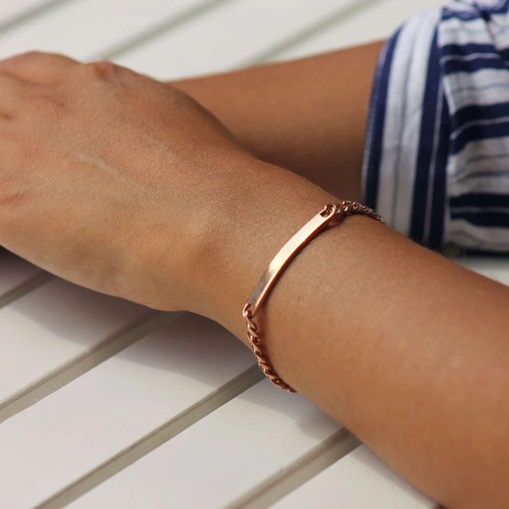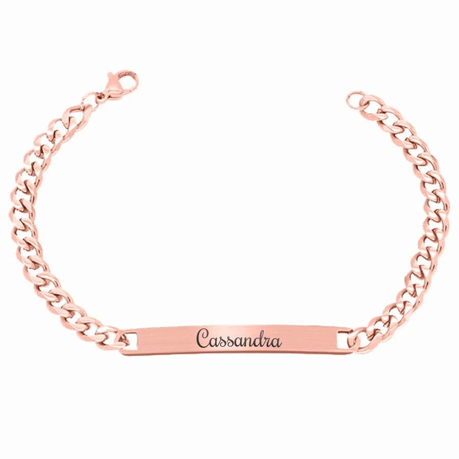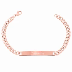 Très jolie gourmette en acier rosée à personnaliser suivant vos envies. Possibilité de graver au recto/verso avec une première gravure offerte. Elégante et à la fois moderne elle séduira sans aucun doute la gent féminine. Dotée d’un fermoir carabine pour une meilleure sécurité, elle est disponible en taille 19 et 21 cm. C’est une idée de cadeau très bien choisie pour une personne que l’on adore.