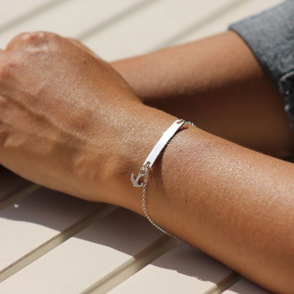 Très jolie gourmette en argent massif 925 agrĂ©mentĂ©e d’une ancre marine sertie de zirconium. Personnalisable au recto/verso avec une gravure laser ou diamant au choix. La gourmette est rĂ©glable en longueur avec des anneaux d’attache complĂ©mentaire, elle s’adapte Ă de nombreux poignets fĂ©minins. Les femmes adorent porter une gourmette pour parfaire leur look, surtout si elle est unique.