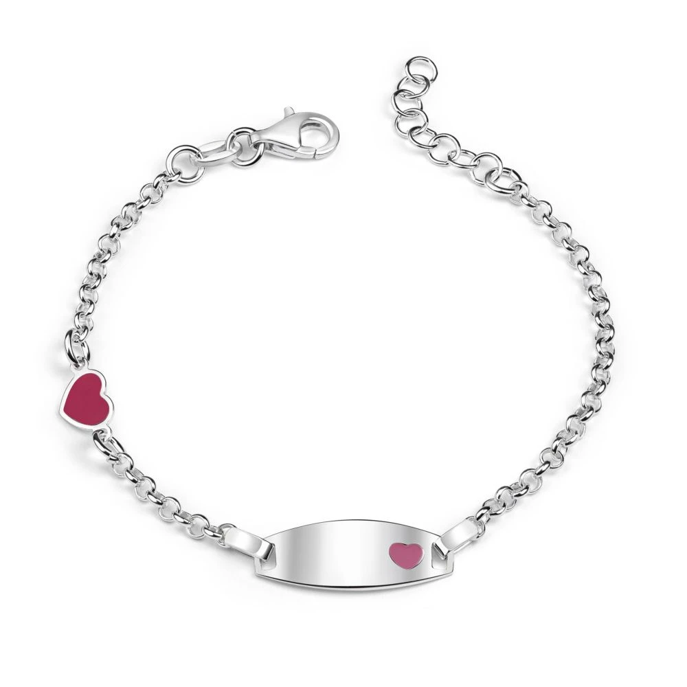 Les petites filles aiment les bijoux avec des coeurs et de couleur rose. Cette jolie gourmette en argent les fera craquer avec ses deux petits coeurs roses Ă©maillĂ©s, un sur la plaque de gravure ovale et un au niveau de la chaĂ®ne. L’extension de la chaĂ®ne permettra d’en profiter sur plusieurs annĂ©es. Personnalisez-la en faisant graver son prĂ©nom, une date de naissance ou encore un petit symbole mignon, avec la première gravure diamant offerte! Faites plaisir en offrant ce bijou personnalisĂ© Ă une petite fille pour un anniversaire, un baptĂŞme ou encore une communion.