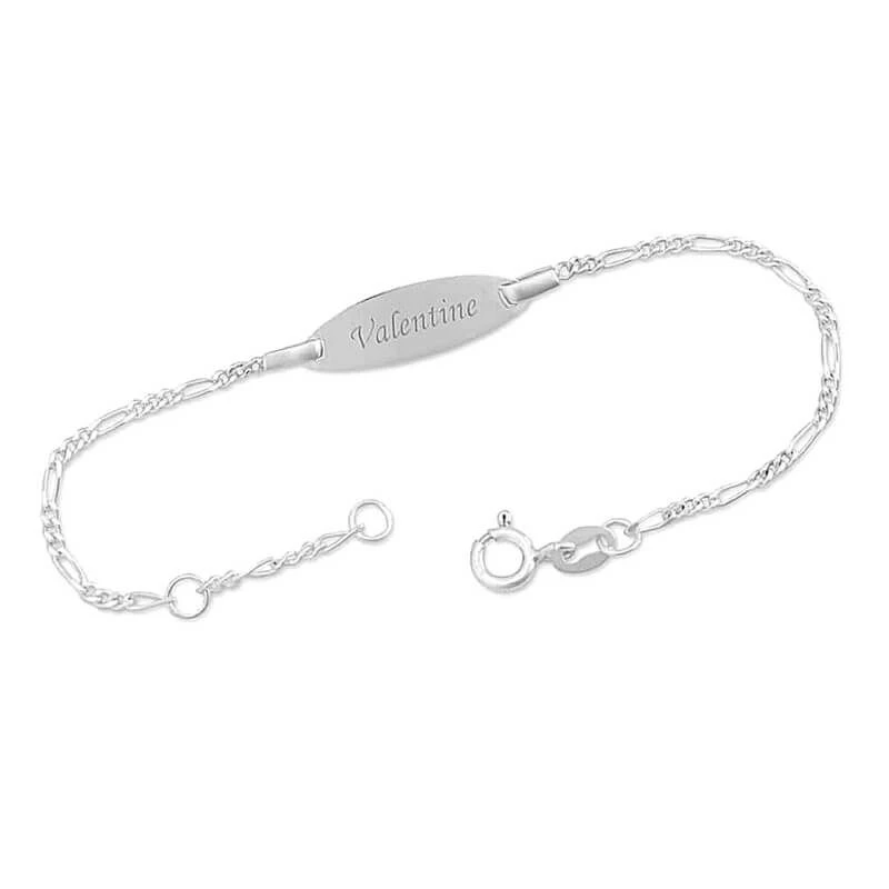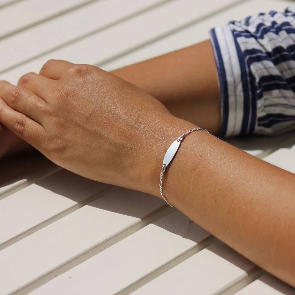 Très jolie gourmette en argent massif 925 avec fine chaĂ®ne maille figaro, plaque d’identitĂ© ovale et fermoir rond. Elle peut ĂŞtre gravĂ©e de chaque cotĂ© en 6 polices de style diffĂ©rent, la première gravure diamant est offerte. C’est un magnifique cadeau Ă offrir Ă un ĂŞtre cher.