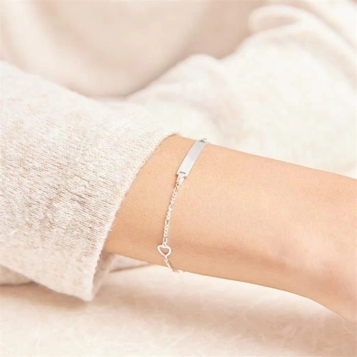 Mignonne gourmette en argent 925 poli en maille figaro agrĂ©mentĂ©e d’un cĹ“ur de chaque cĂ´tĂ© de la plaque rectangulaire. Le bracelet se ferme Ă l’aide d’un mousqueton classique et est disponible en diffĂ©rentes longueurs. L’anneau intermĂ©diaire permet de raccourcir la longueur du bracelet d’environ 2-3 cm. Profitez de la première gravure diamant gratuite avec un nom, une date, ou encore un symbole. C’est parfait comme cadeau Ă offrir ou pour se faire plaisir.
