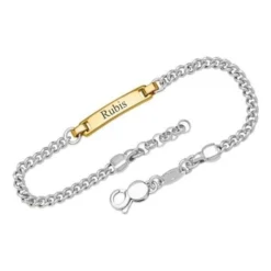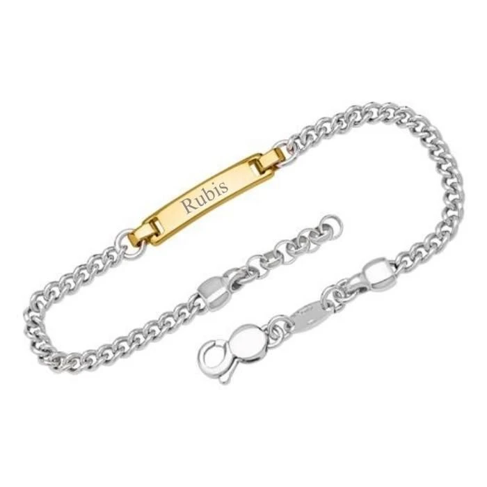 ElĂ©gant bracelet en argent 925 poli et rhodiĂ© avec une maille gourmette classique et une plaque rectangulaire dorĂ©e Ă la surface gravable. Grâce au rhodiage, votre bijou sera protĂ©gĂ© du ternissement. La gourmette est dotĂ©e d’un fermoir mousqueton pour un plus grand confort. Une extension intĂ©grĂ©e Ă la gourmette permet d’adapter la longueur du bracelet d’environ 3 cm. Profitez de la première gravure diamant gratuite avec un nom, une date, ou encore un symbole. C’est parfait comme cadeau Ă offrir ou pour se faire plaisir.