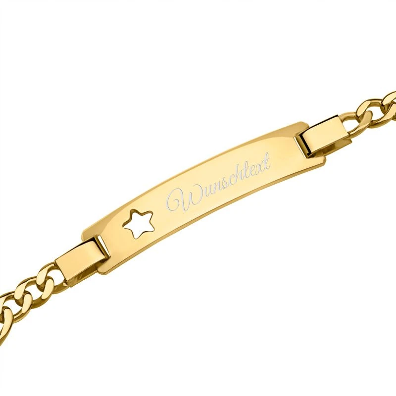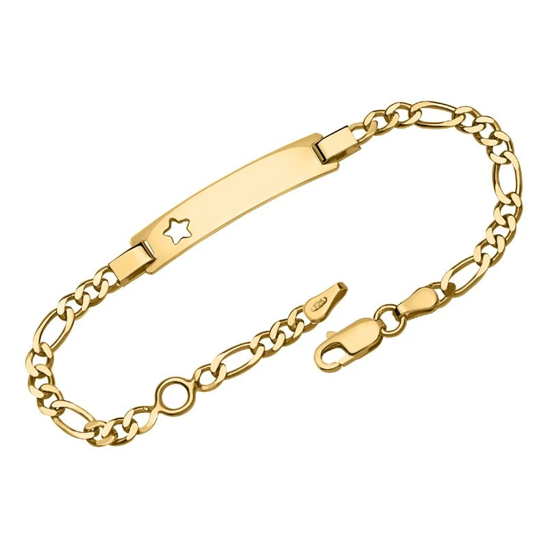 Jolie gourmette en maille figaro en argent 925 poli de couleur dorĂ©e avec une petite Ă©toile ajourĂ©e sur la plaque rectangulaire. Le bracelet se ferme Ă l’aide d’un mousqueton classique et est disponible en diffĂ©rentes longueurs. L’anneau intermĂ©diaire permet de raccourcir la longueur du bracelet d’environ 2-3 cm. Profitez de la première gravure diamant gratuite avec un nom, une date, ou encore un symbole. C’est parfait comme cadeau Ă offrir ou pour se faire plaisir.