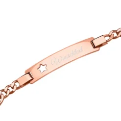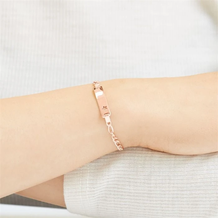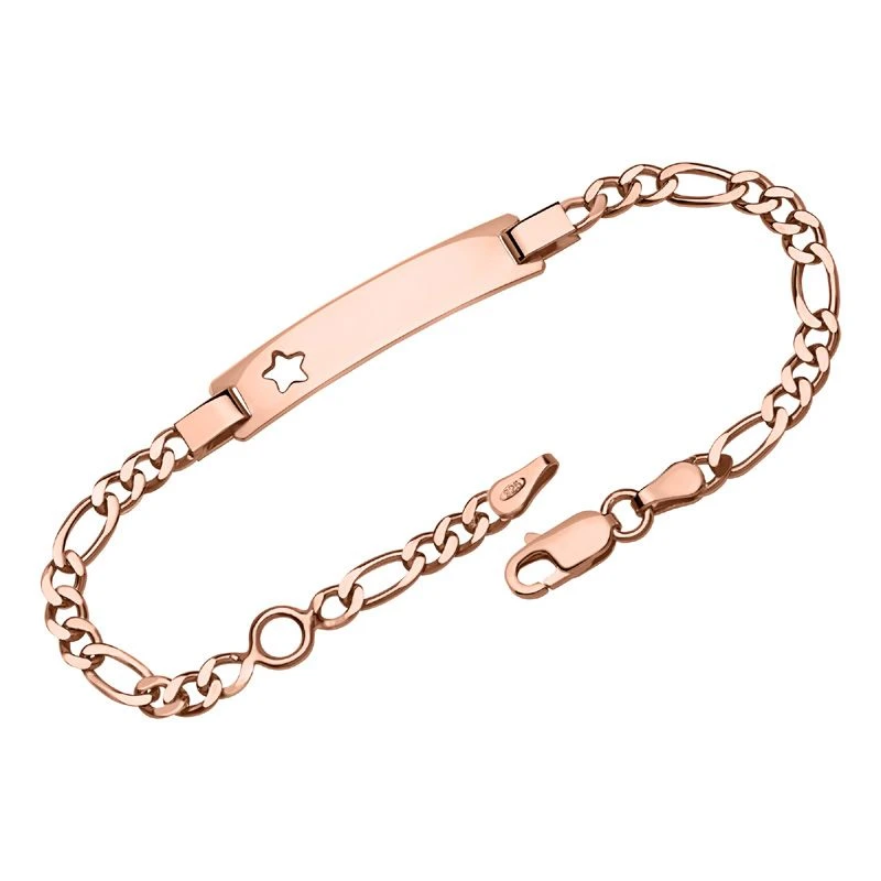 Jolie gourmette en maille figaro en argent 925 poli de couleur rosĂ©e avec une petite Ă©toile ajourĂ©e sur la plaque rectangulaire. Le bracelet se ferme Ă l’aide d’un mousqueton classique et est disponible en diffĂ©rentes longueurs. L’anneau intermĂ©diaire permet de raccourcir la longueur du bracelet d’environ 2-3 cm. Profitez de la première gravure diamant gratuite avec un nom, une date, ou encore un symbole. C’est parfait comme cadeau Ă offrir ou pour se faire plaisir.