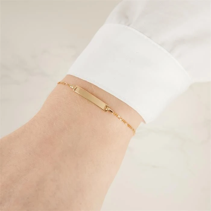 ElĂ©gante gourmette en or jaune 585 en maille figaro avec sa plaque rectangulaire joliment ciselĂ©e sur ses contours et son fermoir mousqueton pour un plus grand confort. Le bracelet en or est disponible en diffĂ©rentes longueurs. L’anneau intermĂ©diaire permet de raccourcir la longueur du bracelet d’environ 2-3 cm. Profitez de la première gravure diamant gratuite avec un nom, une date, ou encore un symbole. C’est parfait comme cadeau Ă offrir ou pour se faire plaisir.