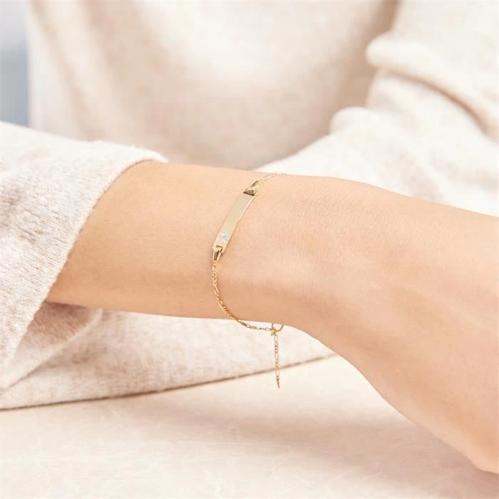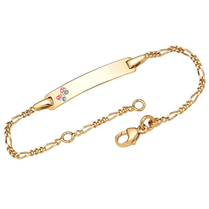 ElĂ©gante gourmette en or jaune 375 en maille figaro avec une plaque rectangulaire gravable et son ravissant papillon rose et bleu. Le bracelet en or se ferme Ă l’aide d’un mousqueton classique et est disponible en diffĂ©rentes longueurs. L’anneau intermĂ©diaire permet de raccourcir la longueur du bracelet d’environ 2-3 cm. Profitez de la première gravure diamant gratuite avec un nom, une date, ou encore un symbole. C’est parfait comme cadeau Ă offrir ou pour se faire plaisir.