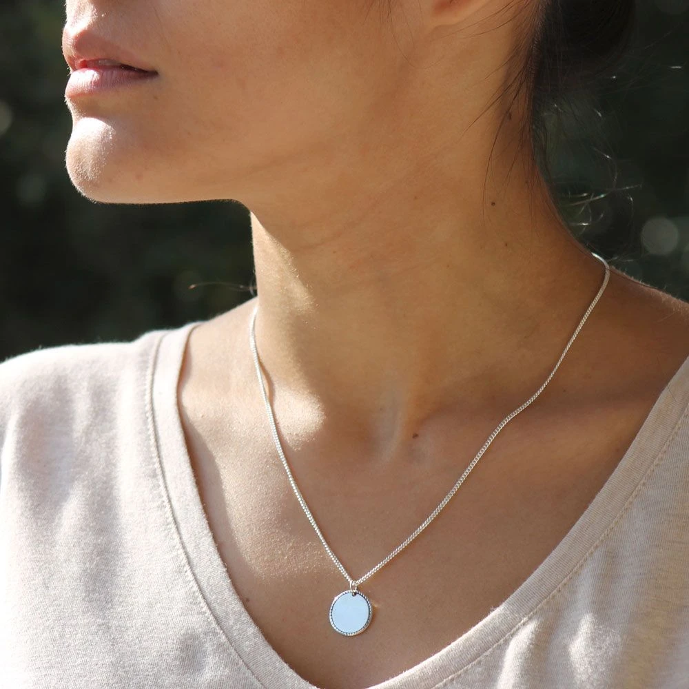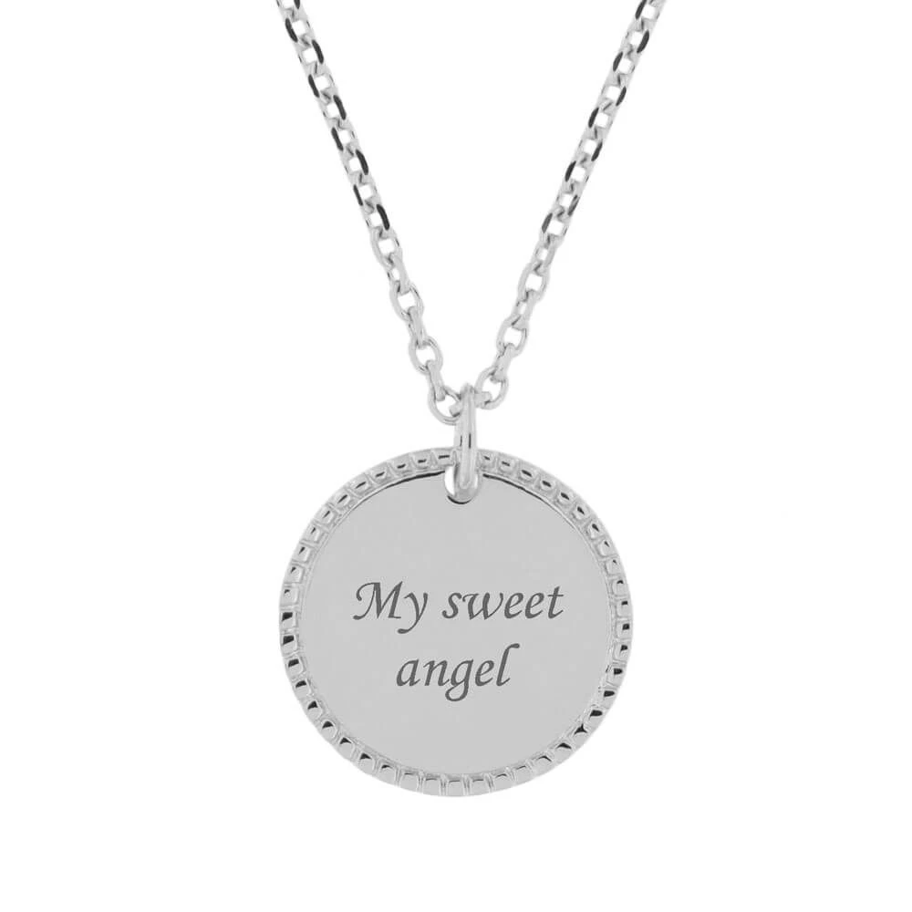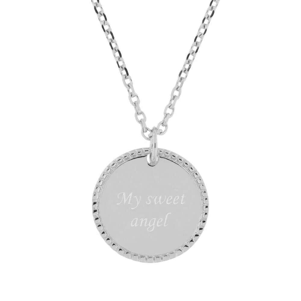 Très élégante médaille en argent 925 personnalisable au recto/verso avec une date importante et/ou un prénom. Ce pendentif argent personnalisé au contour joliment taillé, permet de mettre en valeur la frappe de la médaille. Une chaîne assortie en argent est proposée en option pour compléter ce pendentif. Faites plaisir à un futur baptisé par exemple en offrant ce cadeau personnalisé pour cette occasion toute particulière.