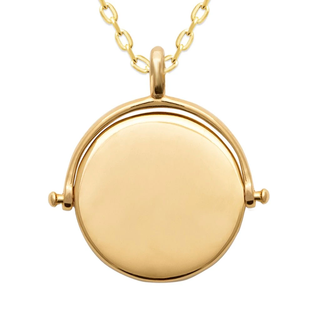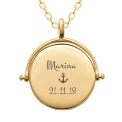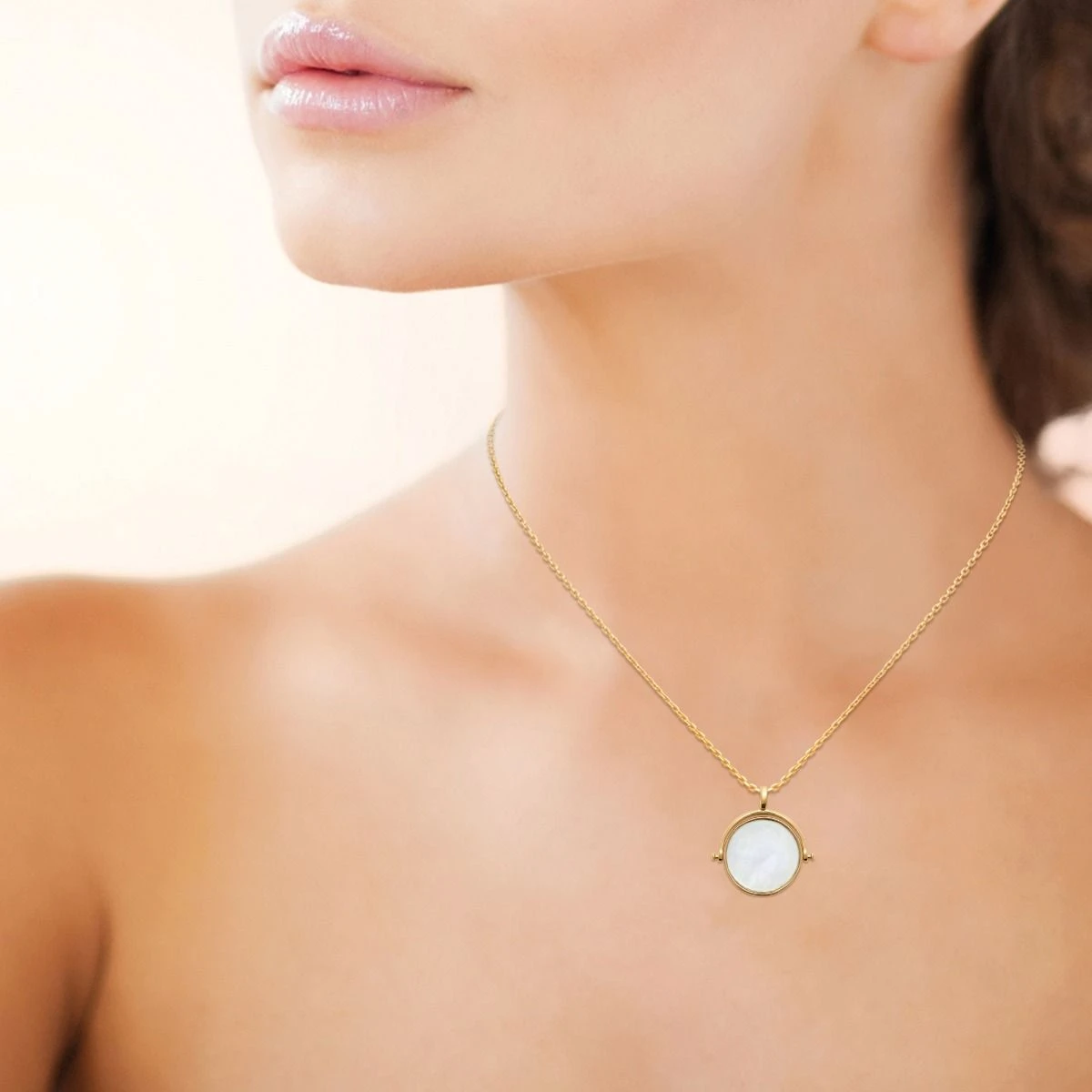Joli médaille pivotante plaqué or 3 microns avec sa pastille ronde nacrée. L’originalité de ce pendentif est sa possibilité de tourner pour faire apparaître soit la face nacrée soit la face lisse gravée. La nacre a la particularité de faire circuler les énergies du corps et d’apaiser celle qui la porte. De plus ce bijou raffiné embellira votre tour de cou. Profitez de la première gravure diamant offerte pour personnaliser le verso avec un symbole, un nom ou encore une date. C’est parfait comme cadeau à offrir ou pour se faire plaisir tout simplement. Une bague assortie vendue séparément complètera votre parure. Une chaîne est également disponible en option.
