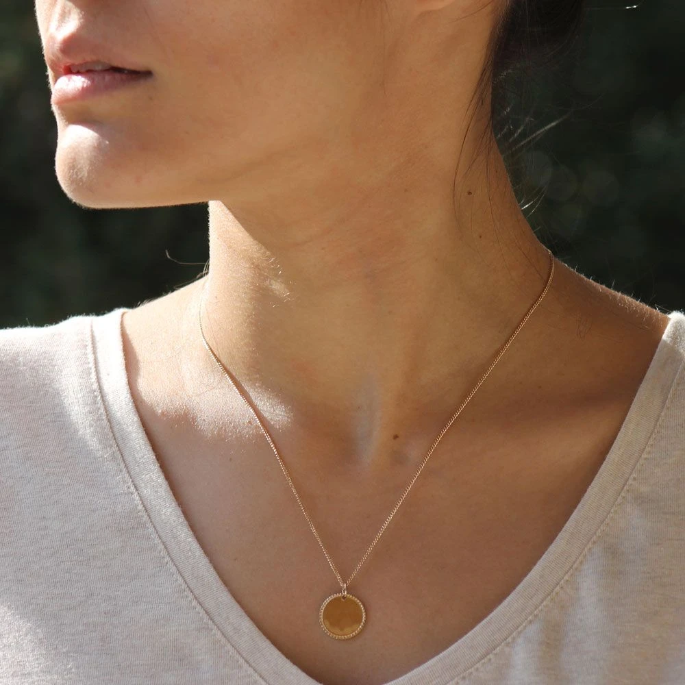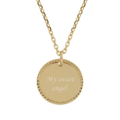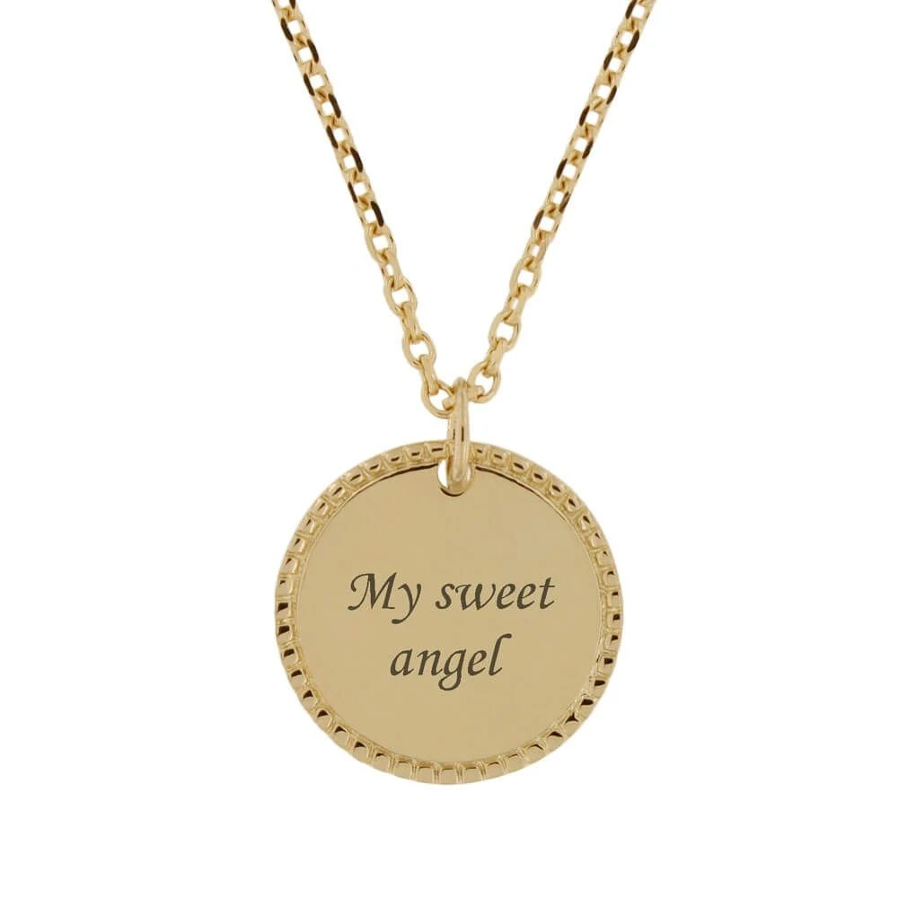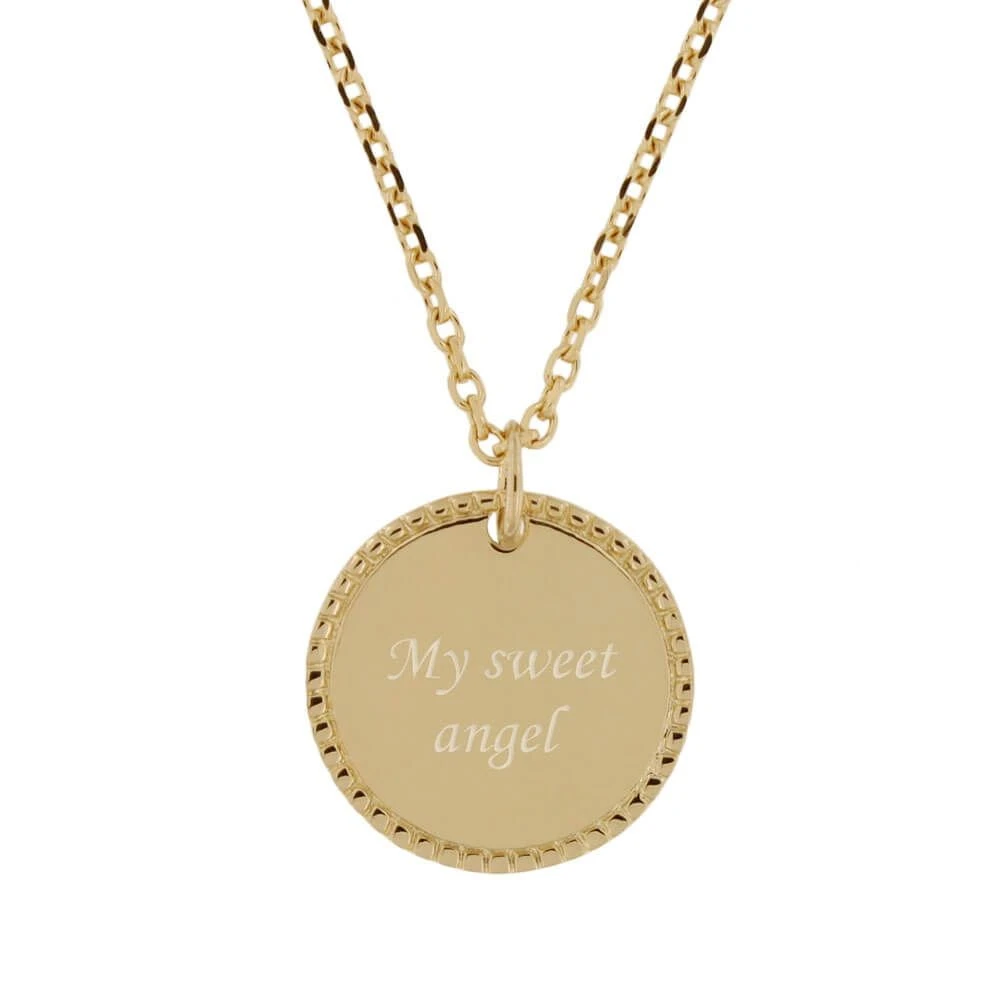 Très élégante médaille en plaqué or personnalisable au recto/verso avec une date importante et/ou le prénom de votre choix. Ce pendentif plaqué or personnalisé au contour joliment taillé, permet de mettre en valeur la frappe de la médaille. Une chaîne assortie en plaqué or est proposée en option pour compléter ce pendentif. Pensez à l’offrir comme cadeau de baptême ou communion par exemple.