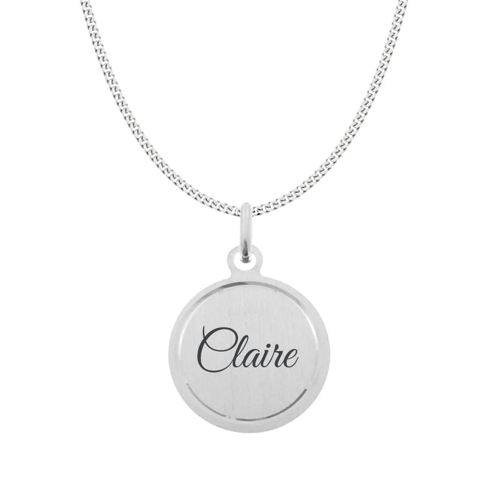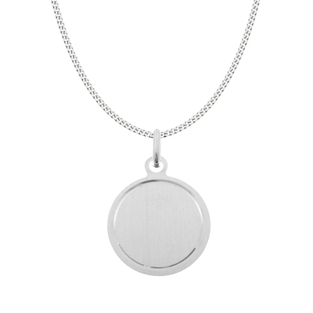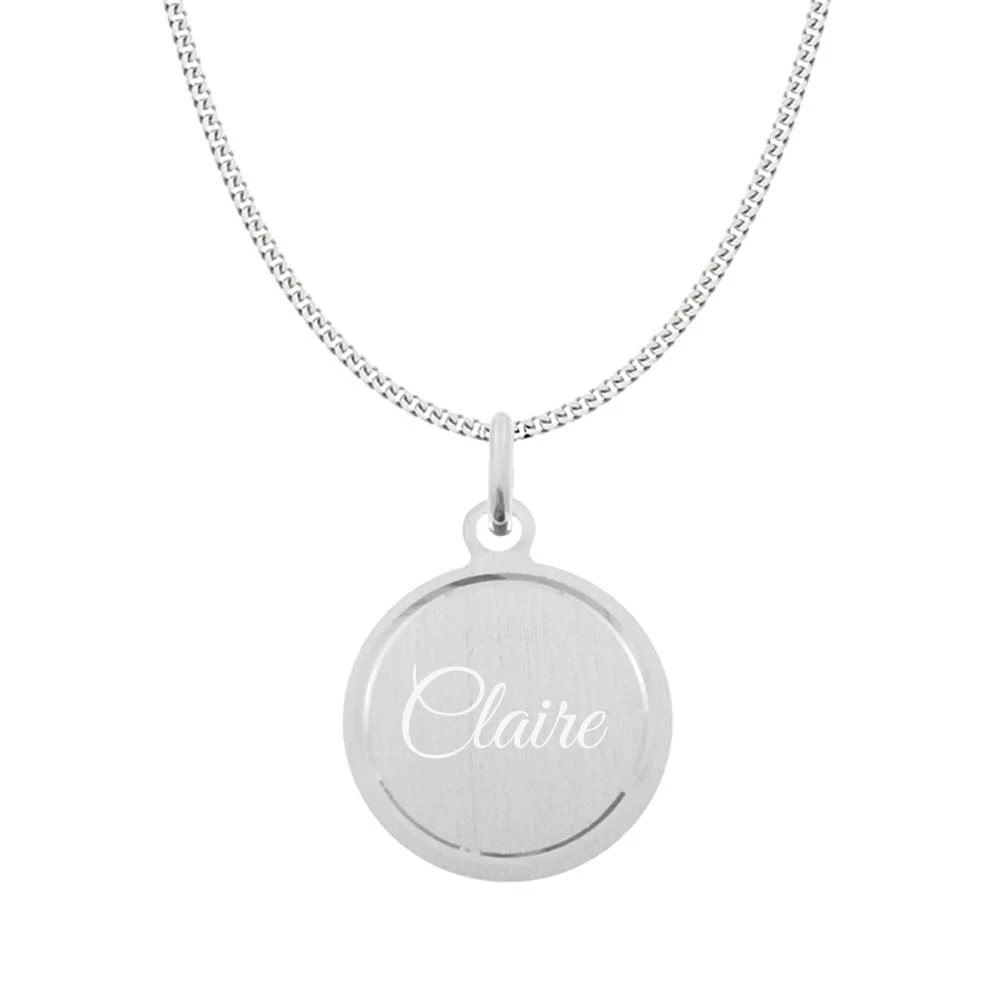 Charmant petit pendentif rond en argent à graver d’un « je t’aime » ou d’un prénom. Un pendentif personnalisé est un cadeau idéal pour la fête des mères ou pour la Saint-Valentin. Finition brossée avec un liseré poli au recto et poli au verso. Discret et raffiné il fera son effet au cou de Madame.