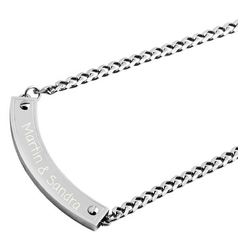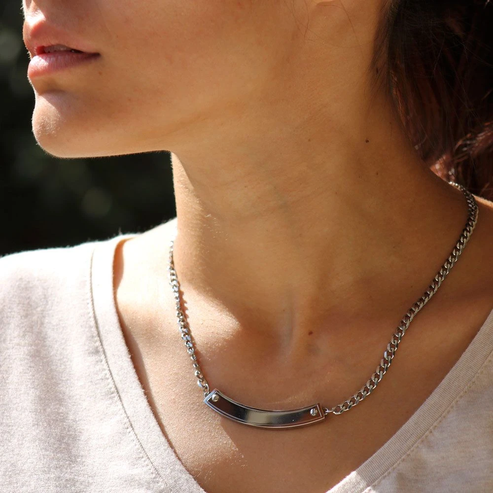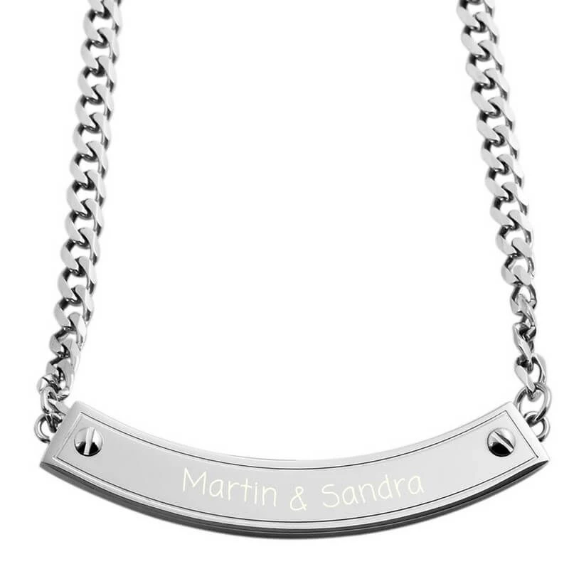 Joli et original pendentif en acier inoxydable couleur argent agrĂ©mentĂ© d’une plaque de gravure courbĂ©e tenue par deux vices de chaque cĂ´tĂ©. Le pendentif est personnalisable au recto avec la gravure offerte. La longueur de la chaine est ajustable grâce Ă ses anneaux d’attache. C’est un cadeau idĂ©al pour faire plaisir.