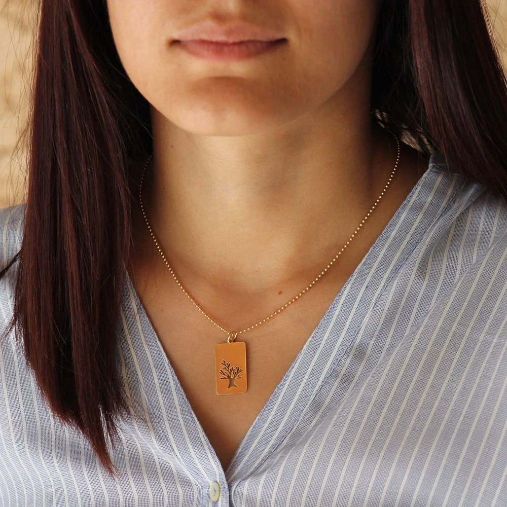 Magnifique pendentif plaque en acier inoxydable doré décoré d’un joli motif arbre de vie. Personnalisable au recto/verso, la première gravure diamant est offerte. Ce pendentif est accompagné d’une jolie chaîne doré assortie, réglable à l’aide d’une rallonge d’anneaux adaptée qui permet de porter ce bijou plus près du cou pour plus de style. C’est un très joli cadeau à offrir pour femmes et enfants.