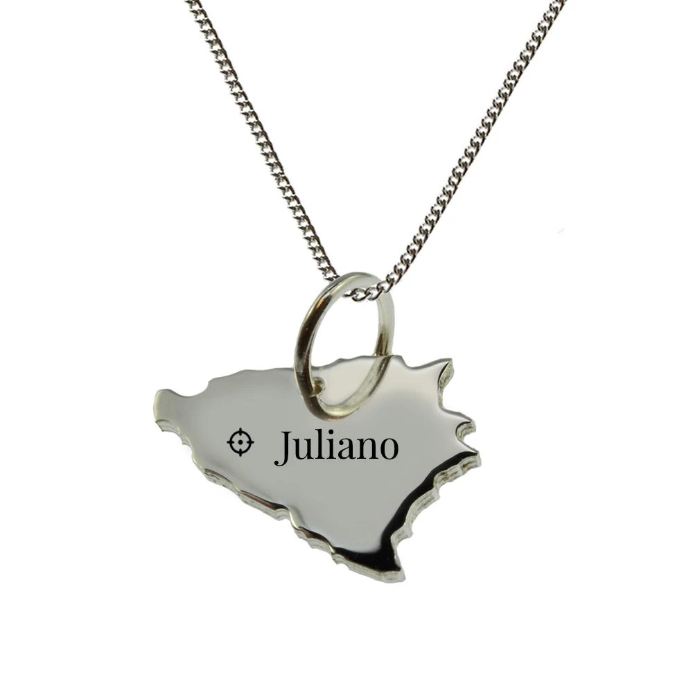 Magnifique et intemporel pendentif en argent 925 sous forme de carte pays, ici reprĂ©sentant la Bosnie. Les pendentifs argent massif sont rĂ©alisĂ©s dans la tradition de notre atelier Allemand, ce qui garantit un travail de haute qualitĂ©. En plus d’ĂŞtre un merveilleux bijou, il est complètement original car vous pourrez y placer Ă l’endroit de votre ville prĂ©fĂ©rĂ©e un symbole de votre choix ! PossibilitĂ© de complĂ©ter ce pendentif avec une chaĂ®ne argent en option. C’est un bijou personnalisĂ© attendu pour les hommes et les femmes attachĂ©s Ă leur pays ou tout simplement pour les grands voyageurs. Si vous ne trouvez pas votre pays dĂ©sirĂ© sur notre boutique, veuillez nous contacter, nous avons tous les pays Ă disposition.