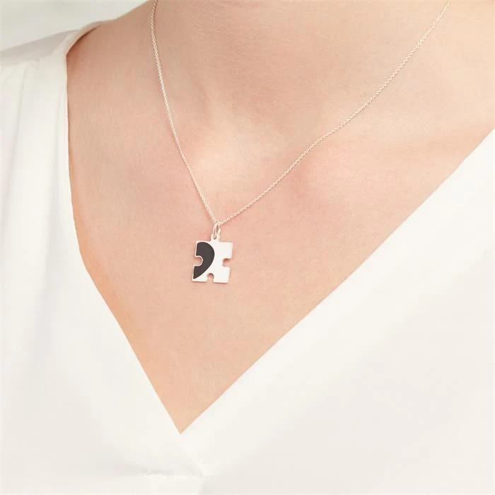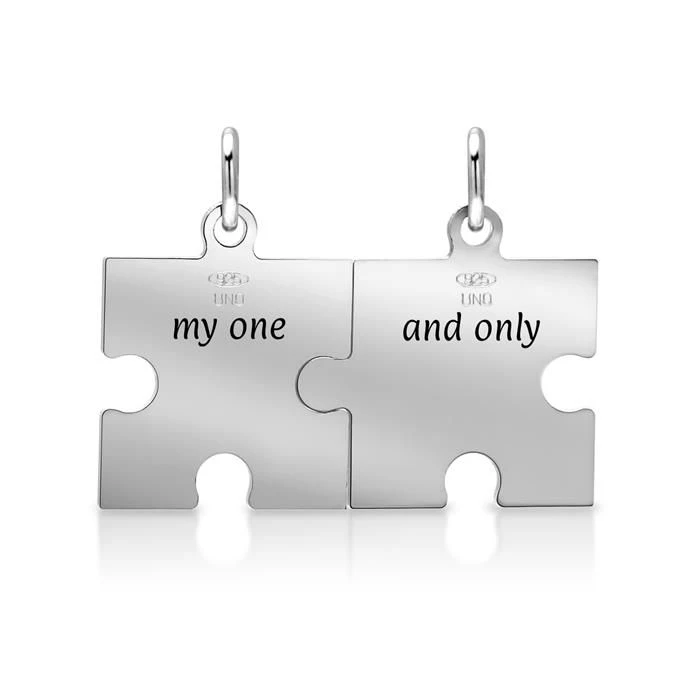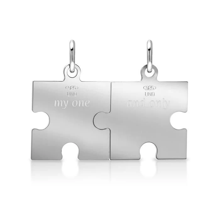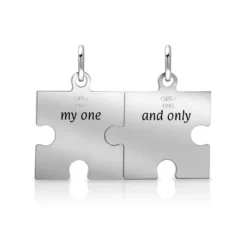 Modernes pendentifs puzzle en acier inoxydable: les 2 moitiés constituent un coeur. Une chaine assortie est disponible en option. Une gravure est offerte pour chacun des pendentifs.