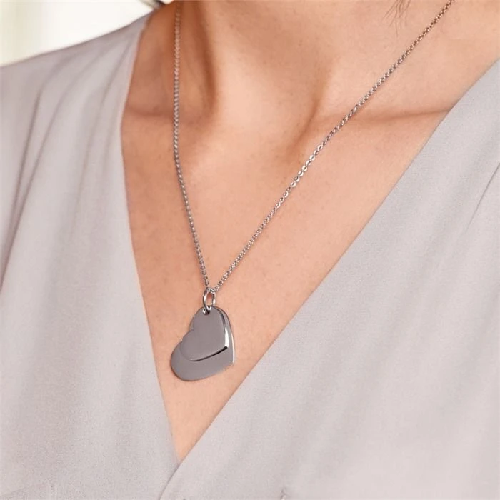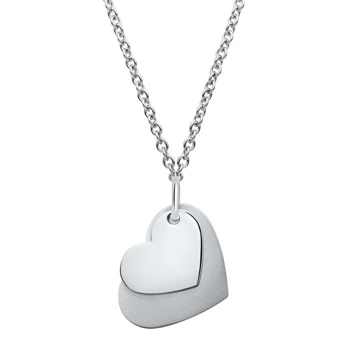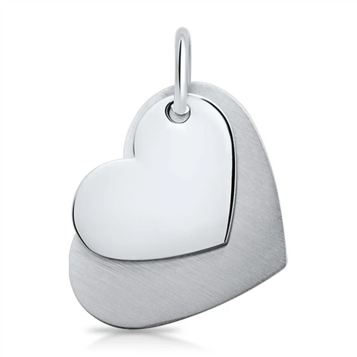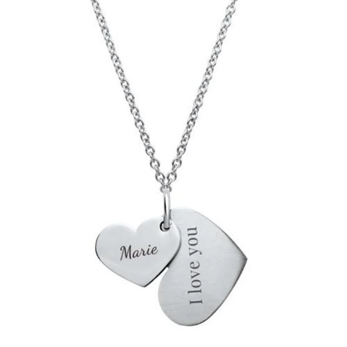 Moderne pendentif en acier inoxydable constituĂ© de 2 coeurs gravables. Le petit coeur est en acier poli des deux cĂ´tĂ©s et le gros coeur est en acier brossĂ© Ă l’avant et poli Ă l’arrière. Une chaine assortie est disponible en option. Une gravure est offerte.