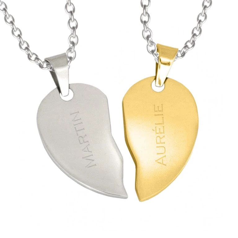 Romantique pendentif cĹ“ur sĂ©cable en acier inoxydable. Il est composĂ© d’une partie gauche argentĂ©e et d’une partie droite dorĂ©e gravable recto/verso. Le cĂ´tĂ© face est poli et l’arrière est mat. Les deux moitiĂ©s forment un joli cĹ“ur. C’est un cadeau unique pour tous les amoureux. Une chaine assortie est disponible en option. Gravure diamant.