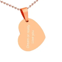 Très original pendentif coeur acier rosé inoxydable, personnalisable au recto/verso sur 3 lignes. Les femmes adorent le romantisme, offrir un coeur pour pendentif prouvera toute votre affection, surtout s’il est gravé d’un sentiment fort. Une chaîne optionnelle pourra parfaire votre bijou. N’ayez plus de doute sur votre cadeau St Valentin, vous serez sûr de faire plaisir.
