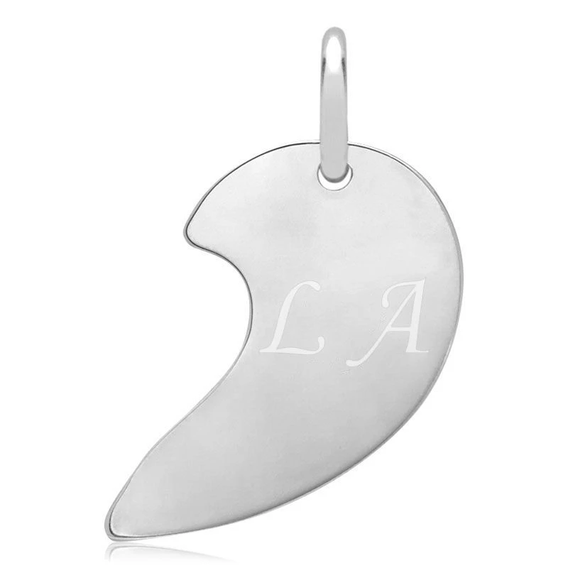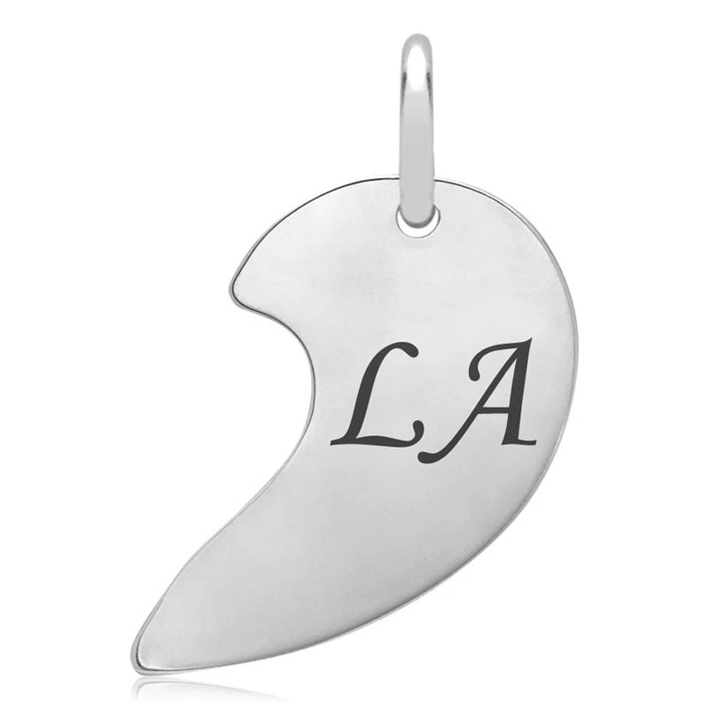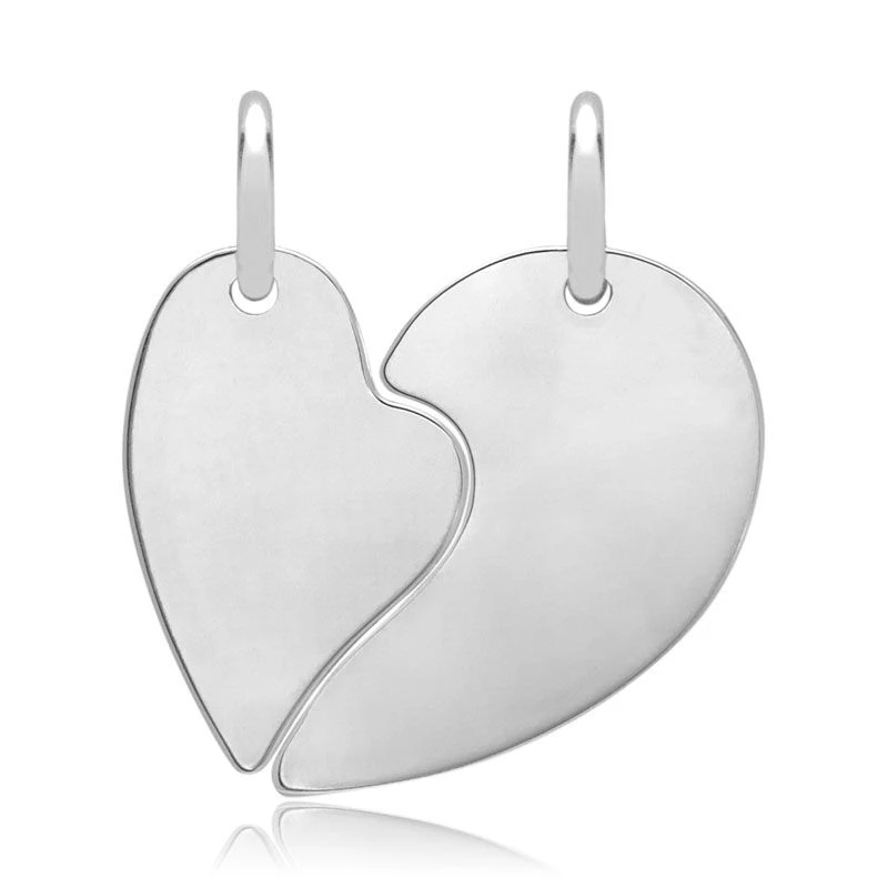 Romantique et moderne pendentif coeur sécable en argent 925. Les deux moitiés du coeur peuvent être gravées recto et verso. Il est le cadeau idéal pour garder votre « moitié » près de vous. La première gravure est offerte. Une jolie chaîne assortie est disponible en option.