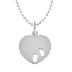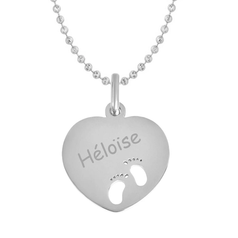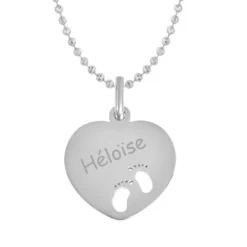 Quoi de plus mignon que des petits pieds de bébé. Immortalisez la naissance d’un bébé avec ce pendentif en forme de cœur en acier à faire graver de sa date de naissance et/ou de son prénom. Personnalisable sur les deux faces, la première gravure diamant est offerte.