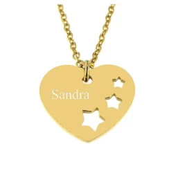 Superbe pendentif cœur en acier inoxydable doré aux motifs des étoiles, personnalisable au recto/verso avec une première gravure diamant offerte. Ce pendentif est accompagné d’une jolie chaîne assortie réglable à l’aide d’une rallonge d’anneaux adaptée permettant de le porter plus près du cou. C’est un magnifique cadeau à offrir à une femme ou un enfant plein de tendresse.