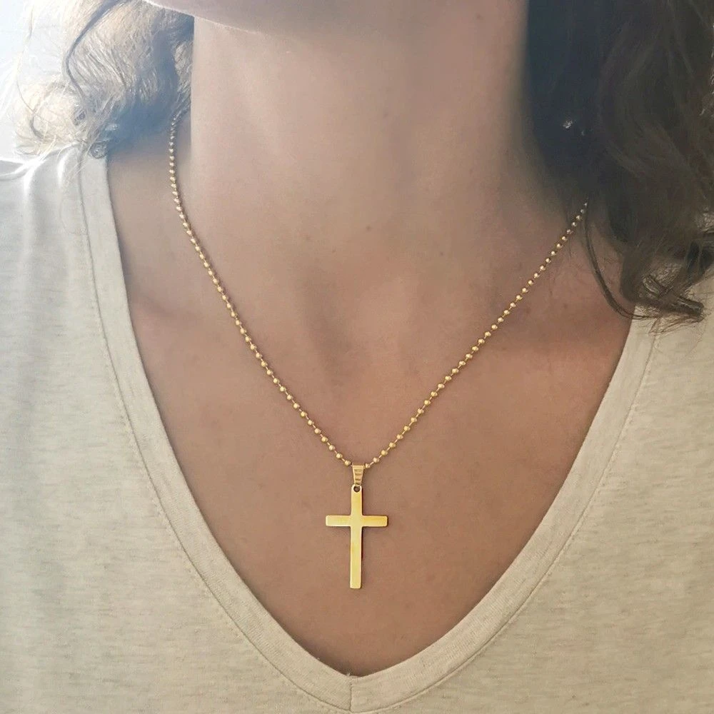 Très joli et moderne pendentif croix en acier doré inoxydable poli. Il peut être gravé horizontalement et verticalement de chaque coté en 6 polices de style différent, la première gravure diamant est offerte. Pour accompagner ce joli pendentif croix une chaîne « boule » dorée est offerte. C’est un magnifique cadeau à offrir pour un homme ou une femme aux convictions profondes.