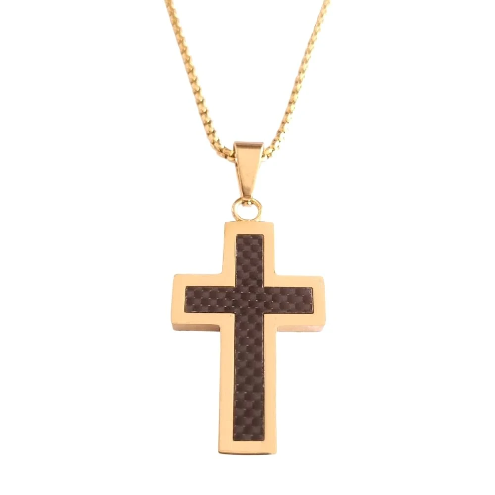 Ce pendentif en forme de croix se distingue par sa simplicité et son caractère unique, mis en valeur par la surface en acier inoxydable plaqué or ionique avec un effet de carbone frappant au centre. Idéal pour mettre en valeur vos convictions spirituelles. Vous avez la possibilité d’ajouter une chaîne et le dos offre un espace pour une gravure. De plus, vous recevrez gratuitement votre première gravure de tête en diamant.