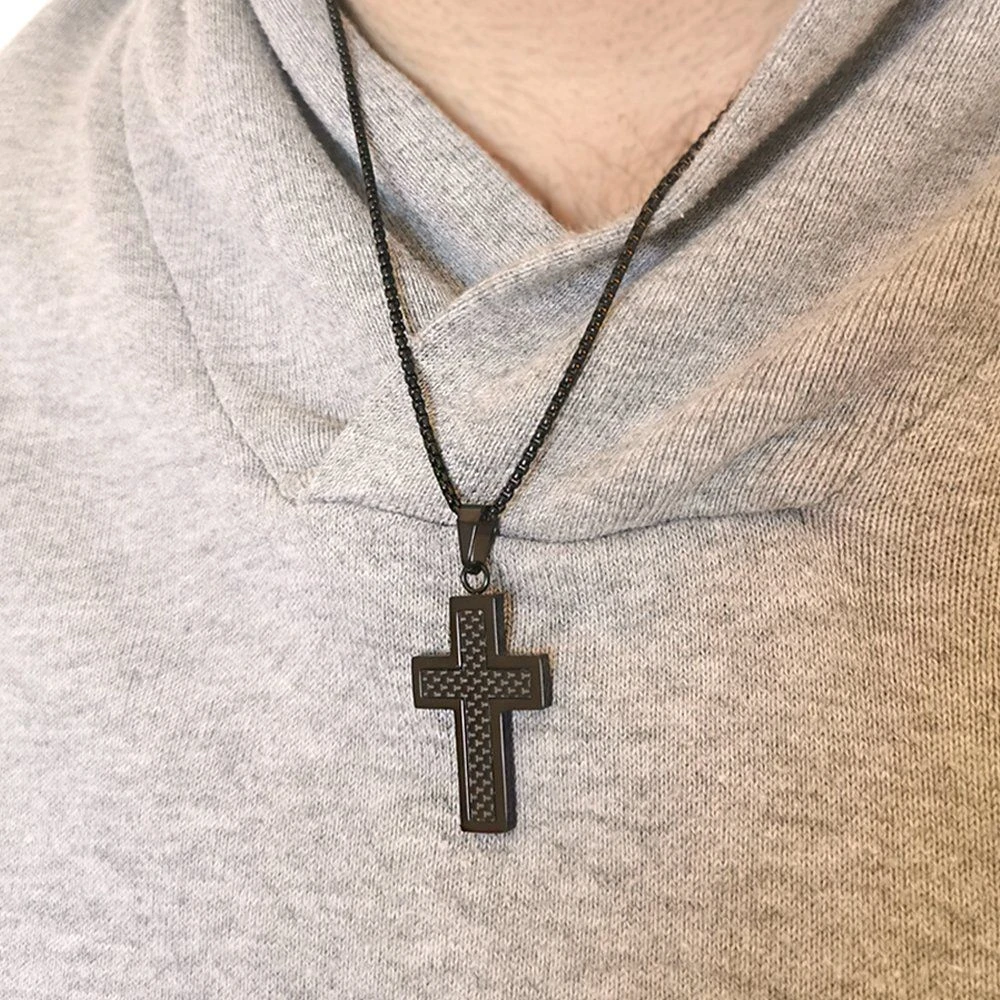 Ce pendentif en forme de croix se distingue par son design simple et original, marqué par une surface noire en acier inoxydable traitée par un procédé ionique et présentant un effet de carbone marqué au centre. Un accessoire parfait pour exprimer votre attachement spirituel. Une chaîne peut être ajoutée en option, et pour une touche personnelle, le dos peut être gravé. De plus, vous recevrez gratuitement votre première gravure de tête en diamant.