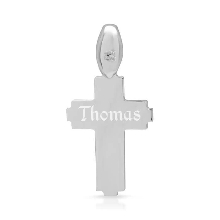 Joli et moderne pendentif croix en argent massif 925. Il peut être gravé en 6 polices de style différent, la gravure laser est offerte. Une chaine argent est proposée en option.