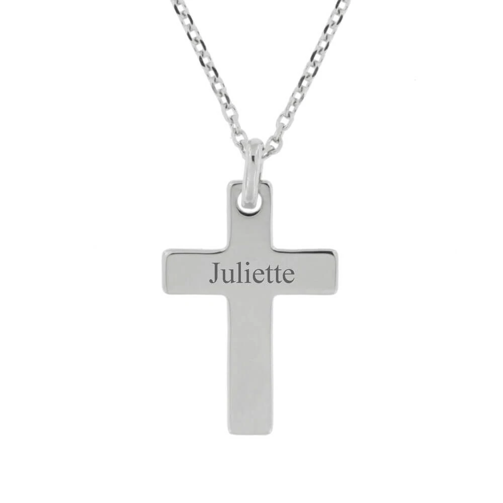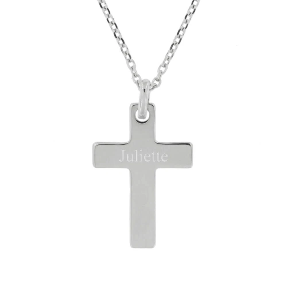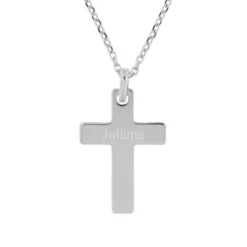 Très joli et délicat pendentif croix en argent, personnalisable au recto/verso. Le sens de la gravure est possible horizontalement ou verticalement. Pour accompagner ce joli collier croix personnalisé, une chaîne optionnelle en argent est proposée. Vous pourrez offrir ce joli bijou unique comme cadeau de baptême/communion, ou bien simplement pour faire plaisir à une femme croyante.