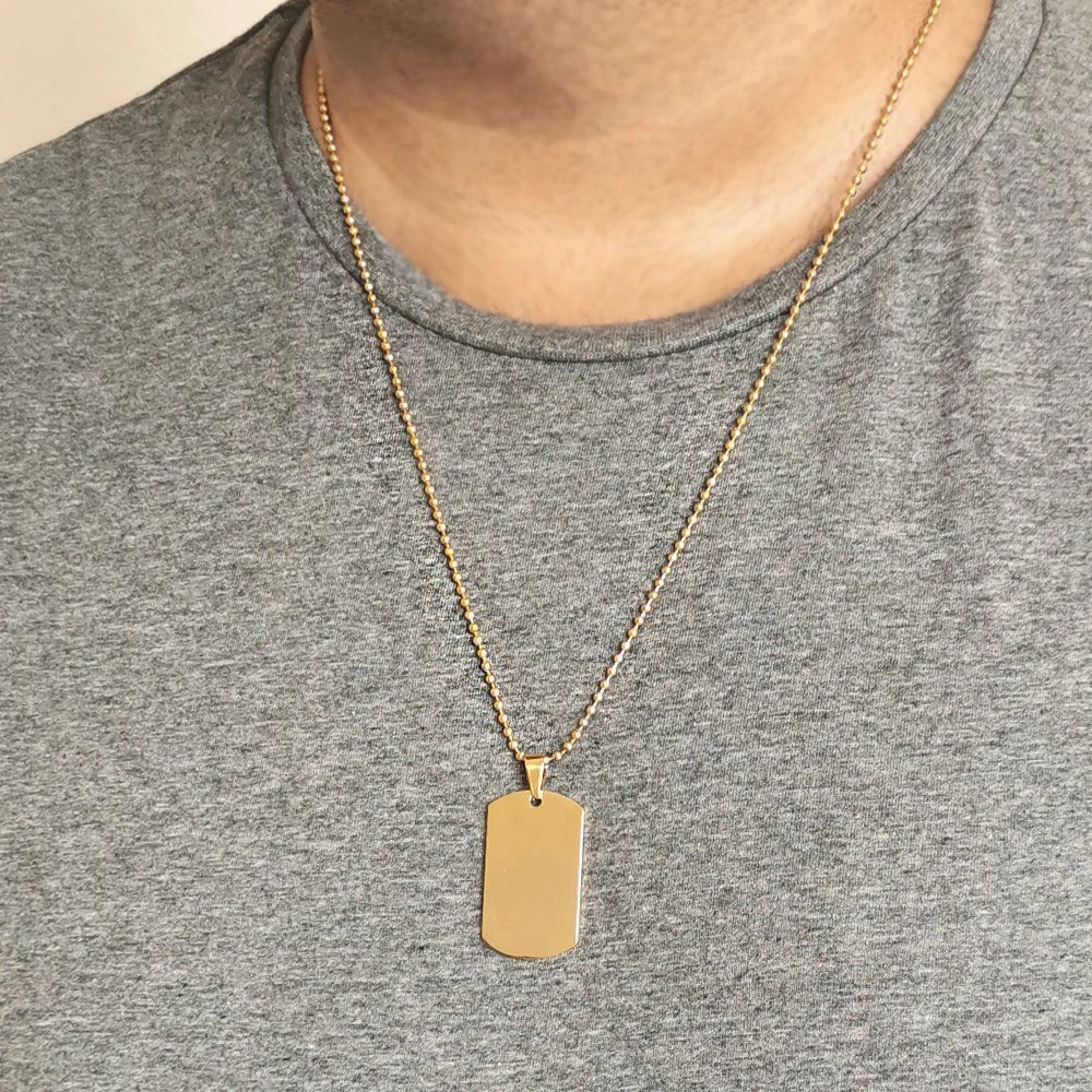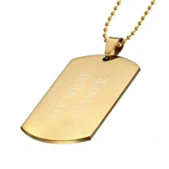Superbe pendentif plaque en acier inoxydable doré personnalisable au recto et au verso, la première gravure est offerte. Ce pendentif peut être accompagné d’une chaîne bille dorée assortie. Possibilité de graver horizontalement et verticalement pour plus de style. C’est l’occasion de faire passer un message fort à l’être aimé.
